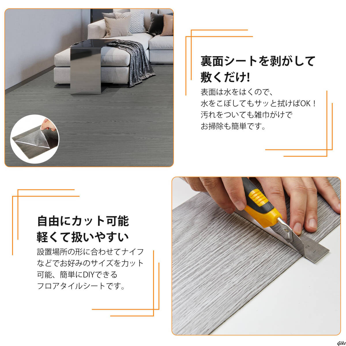 このフロアタイルは、裏面シール仕様で接着剤不要。
