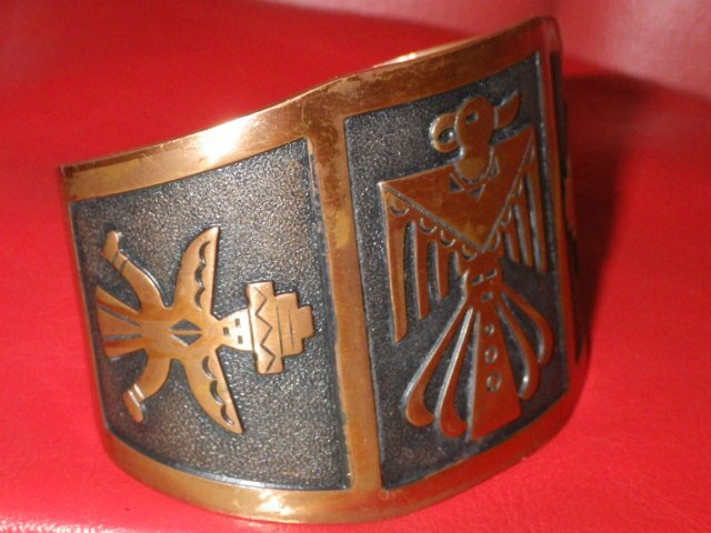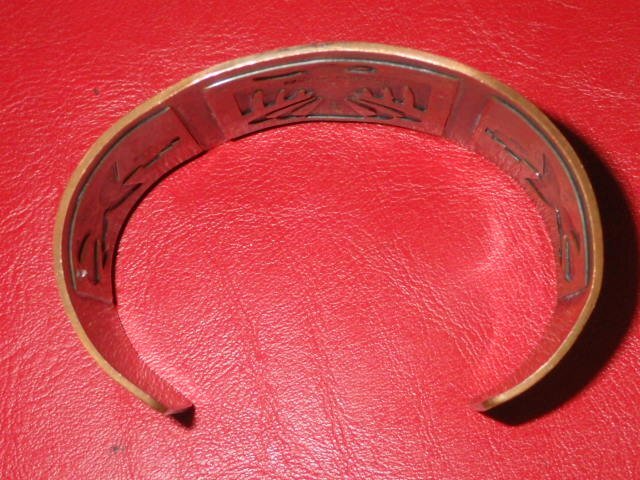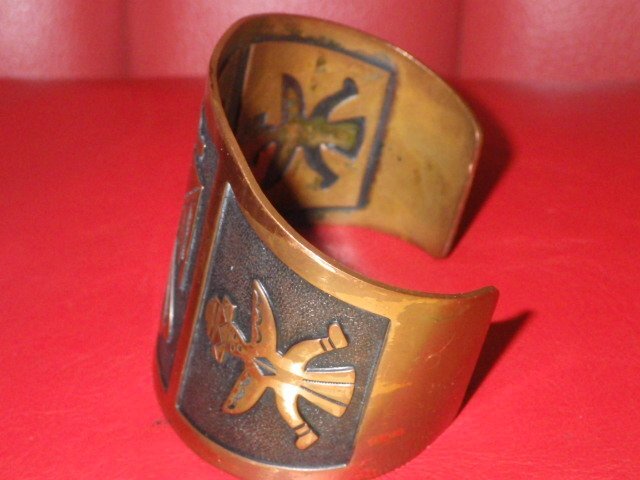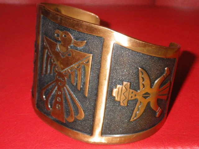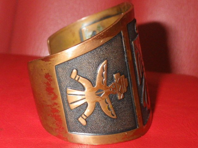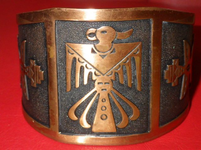 インディアンジュエリーらしい素朴で味わいのあるブレスレットで、こちらのお品は、幸福をもたらす鳥であるサンダーバードが描かれております♪