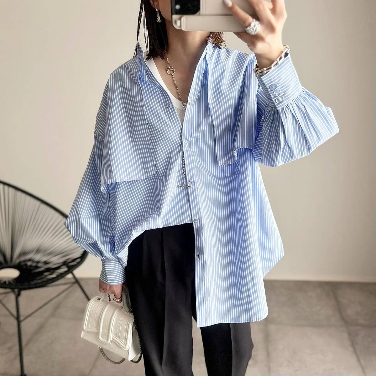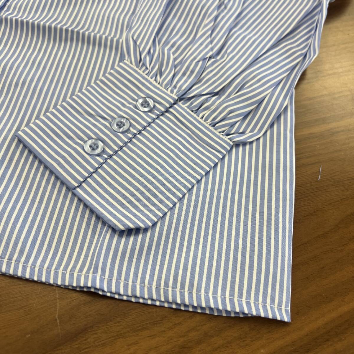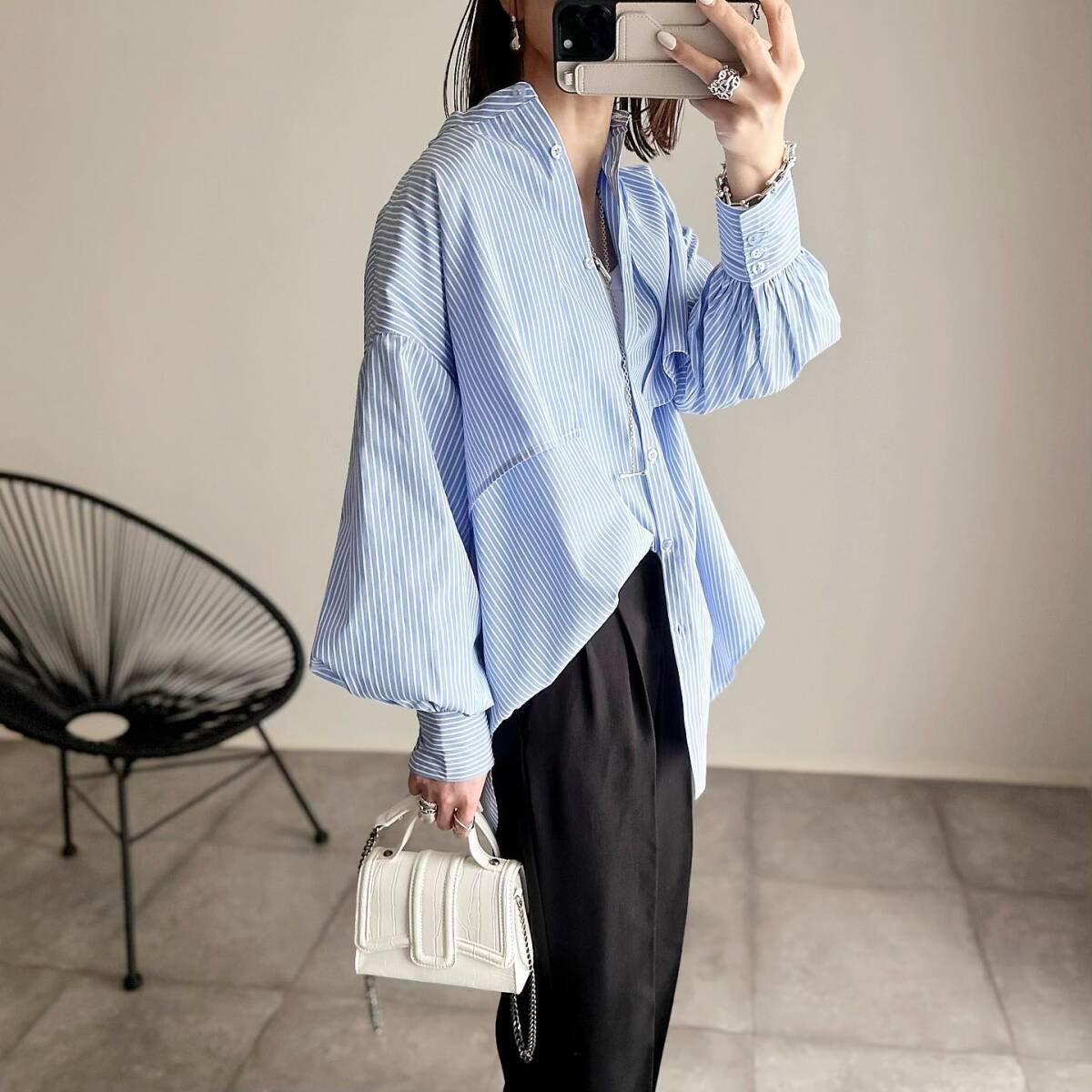 ◆ レディース 変形 シャツ ブルー ストライプ バルーン袖 肩落ち フェミニン おしゃれ ルーズ