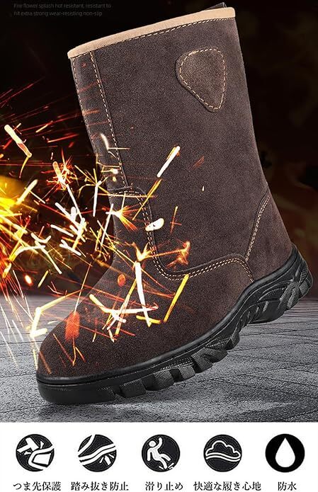 【耐火・耐熱性能】熱職場での作業にも充分耐えうる耐熱性の革を使用しており、火花の飛散や足の火傷を防ぐます。