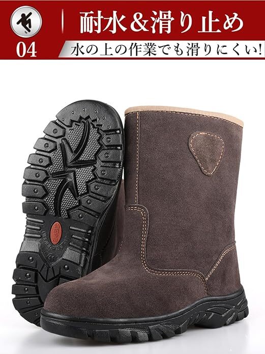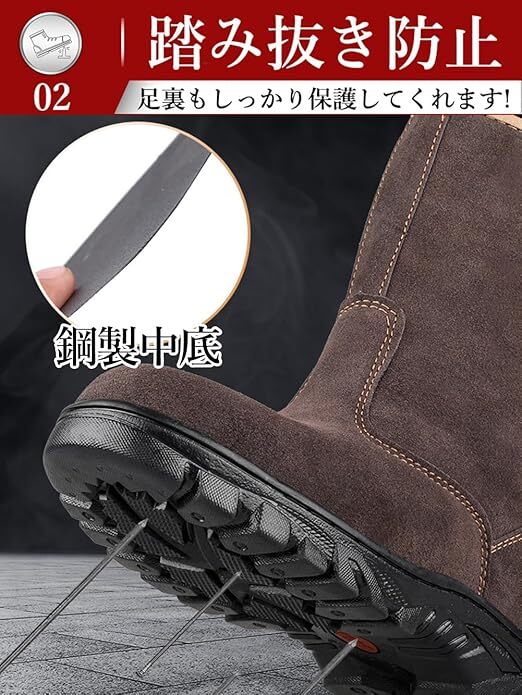 【安全性能】つま先部分には高品質鋼製先芯を採用し、刃物の落下や重量物の衝撃から足をしっかりと守ります。さらに、鋼製中底を搭載し、鋭い釘や尖った物体の踏み抜きから足裏を完全に保護。