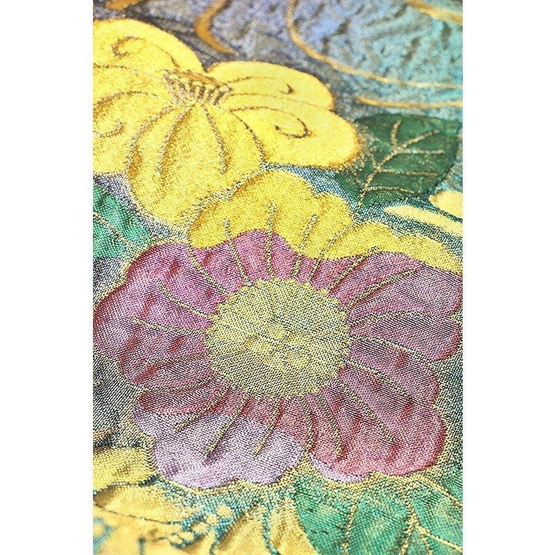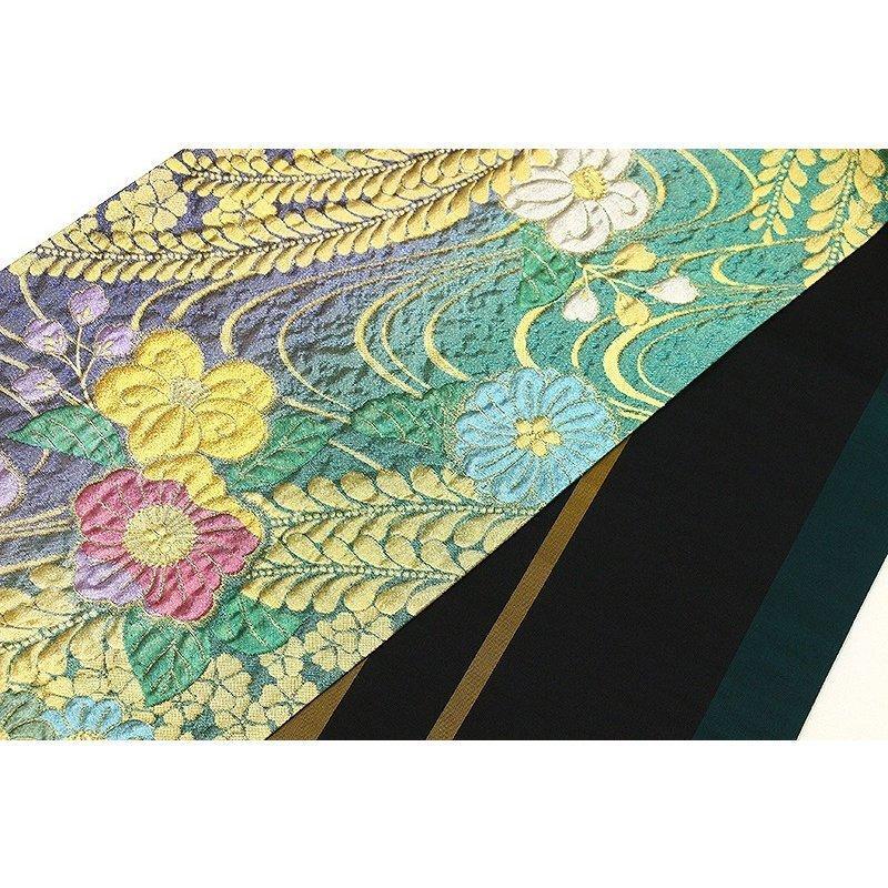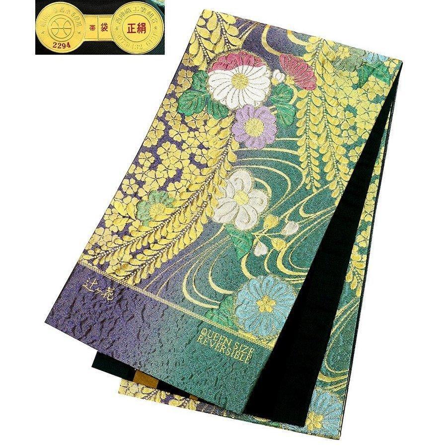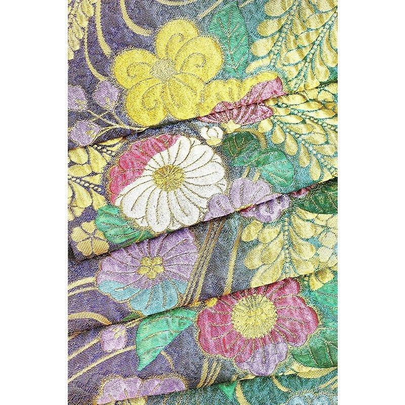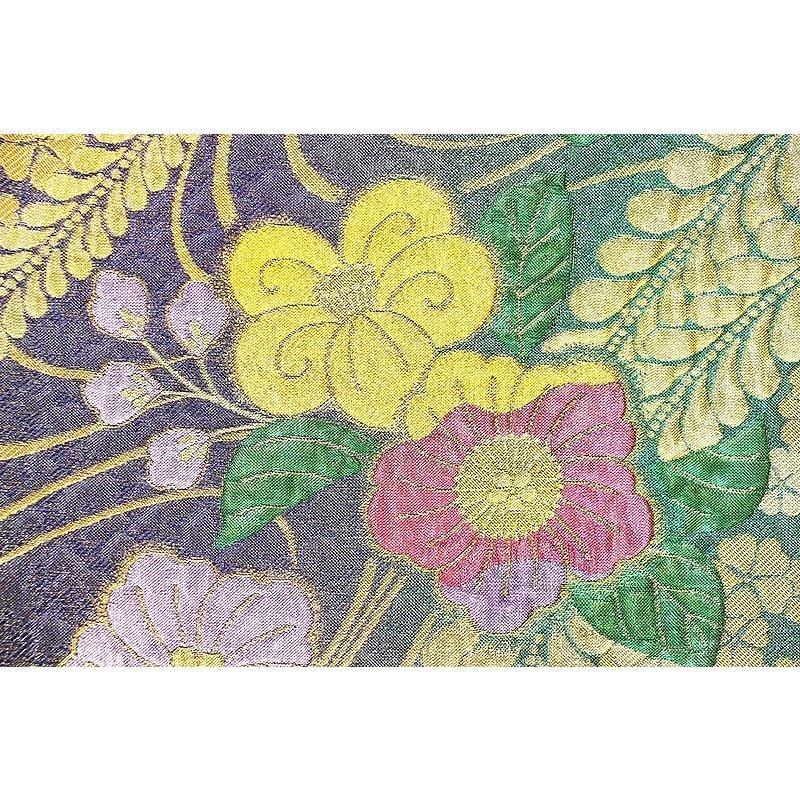 ★品質・詳細 | ○地色 【こちらの地色は緑ラメ×紫ラメ色系の織分けです。】 ○絹織物 ○新品・未仕立の振袖用袋帯です。 ○西陣老舗田原大織物謹製 【証紙番号 2294】 ○長さ 約4.50m ○参考上代 180,000円 |