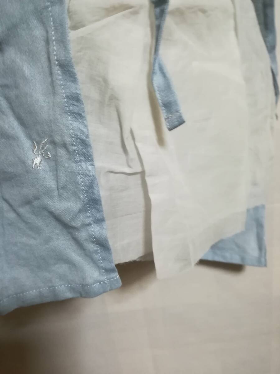タブリエは、画像のようにサイドで紐を結んだり、エプロンのように重なる部分を後ろにしてぐるりを紐を前に回して結んだり。