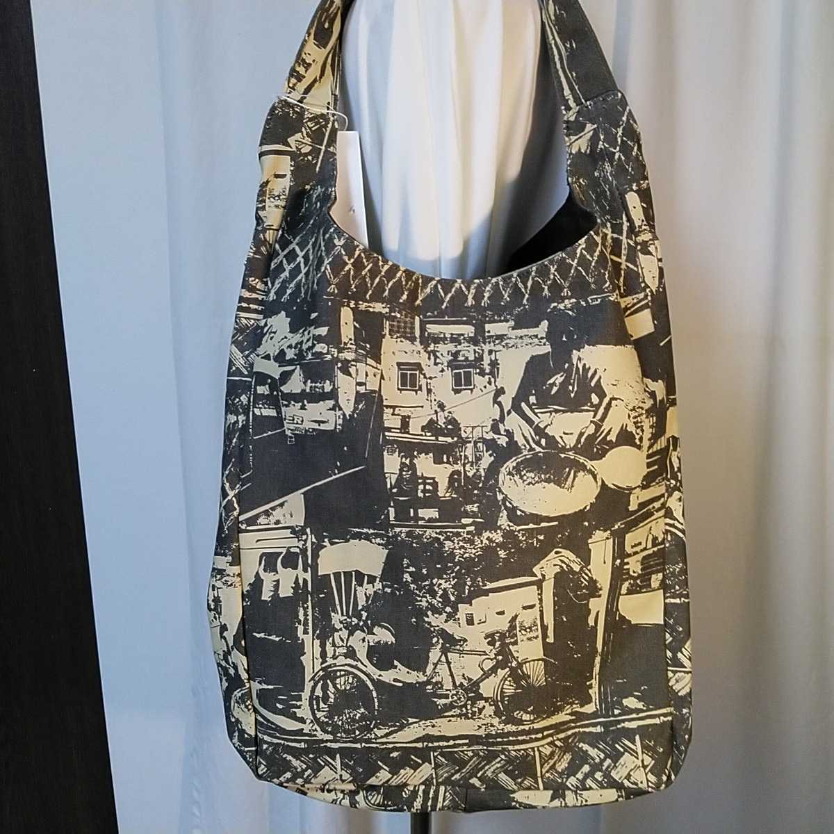 カラー:ベージュ地のキャンバスに、グレーのコルカタの街の柄を反転してプリント