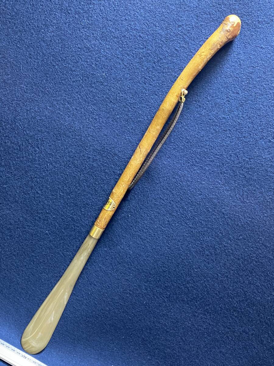 Bing・Oerre製のイタリア製長靴べら(革紐付き、天然木と水牛の角加工風デザイン)は、その上品な素材と実用性から高く評価されるアイテムです。このような靴べらは、インテリアとしての魅力も兼ね備えており、特にハンドメイド感のある製品がコレクターや高級志向の愛好家の関心を引きます。
