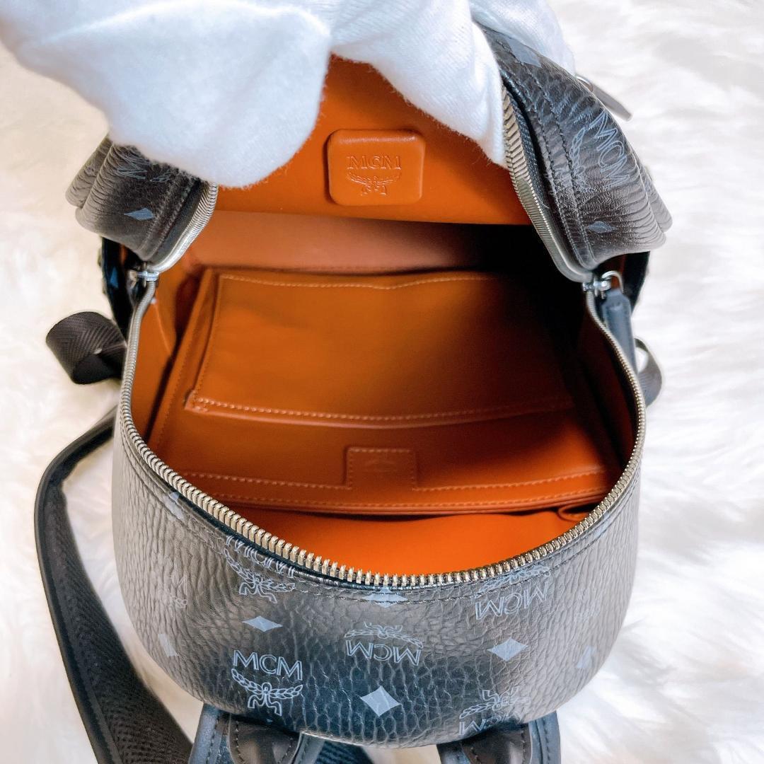 高級感のあるレザー素材に、MCMのアイコニックなモノグラムが全面にあしらわれたリュックサック。フロントポケットに加え、内側はオレンジのレザーがアクセントになっており、収納性も抜群です。サイドにはスタッズが施されており、クールで個性的な印象を演出します。