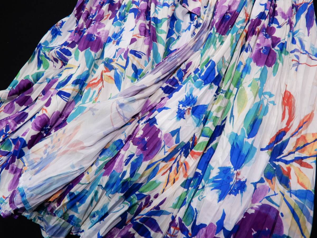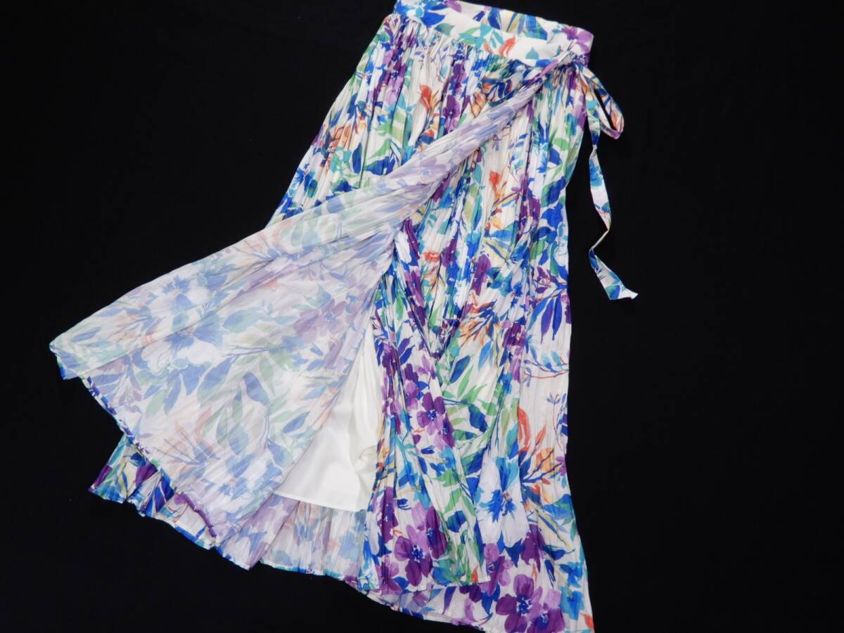 ミラオーウェン スカート サイズ表記:1 お色:白地にプリント 素材:表地、裏地共にポリエステル100% 平置き実寸:w33×2 総丈92㎝位です。 巻きスカートです。 |