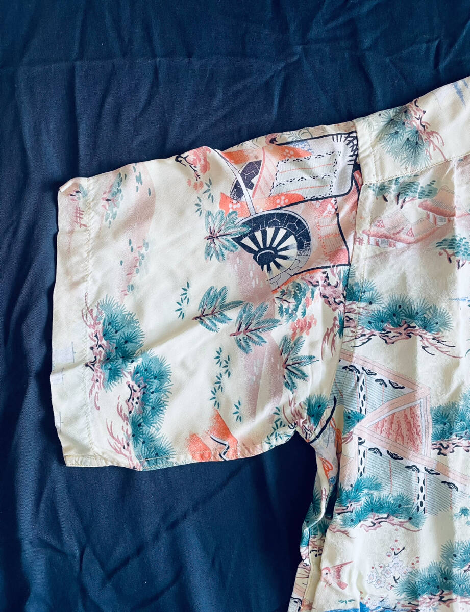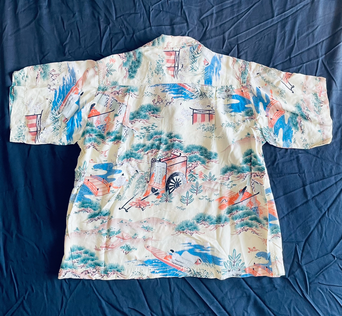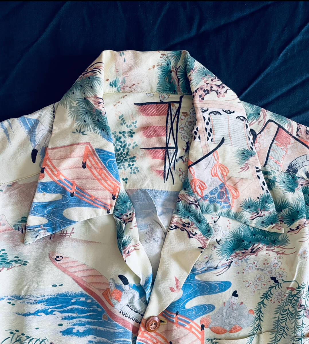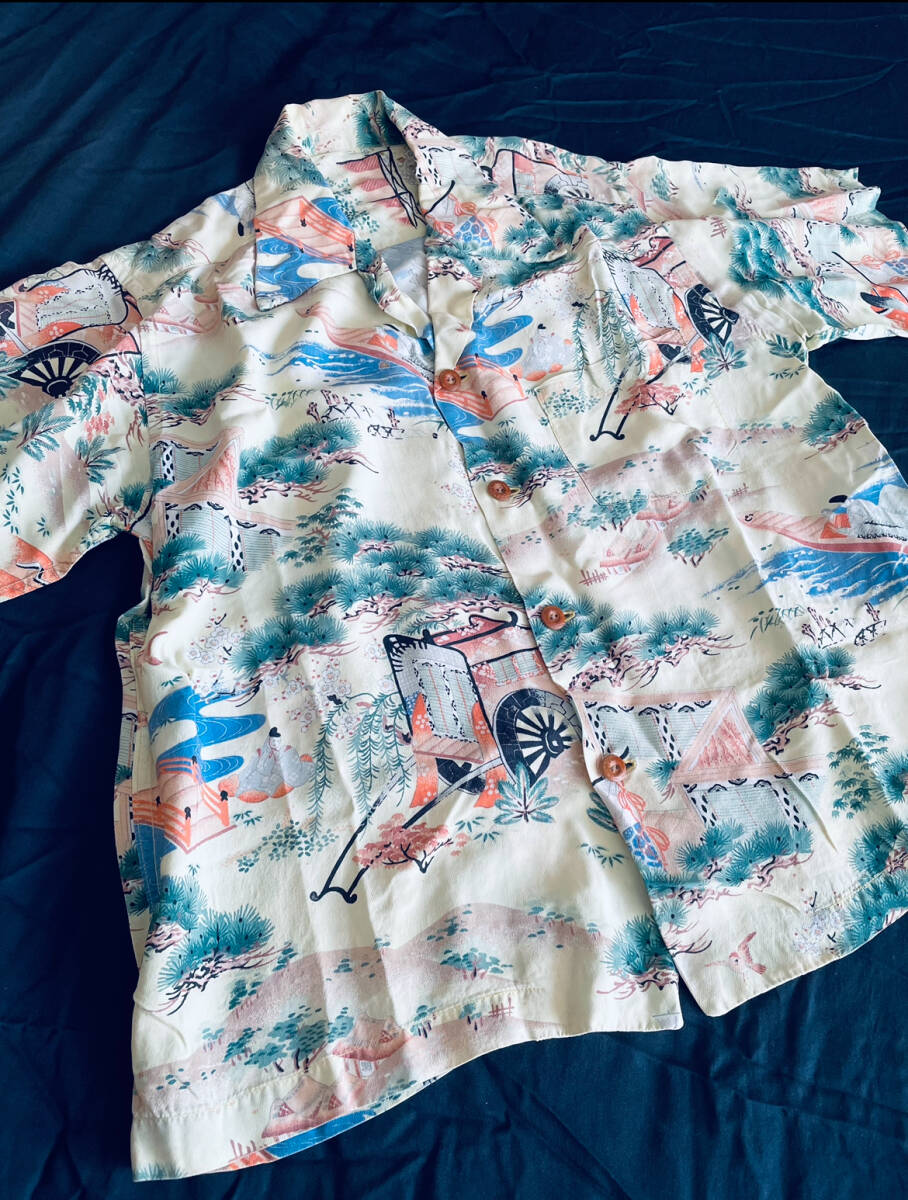 アロハシャツの中でも特に人気が高い和柄の中でも平安時代の絵巻柄は滅多に見ることができない超希少個体です