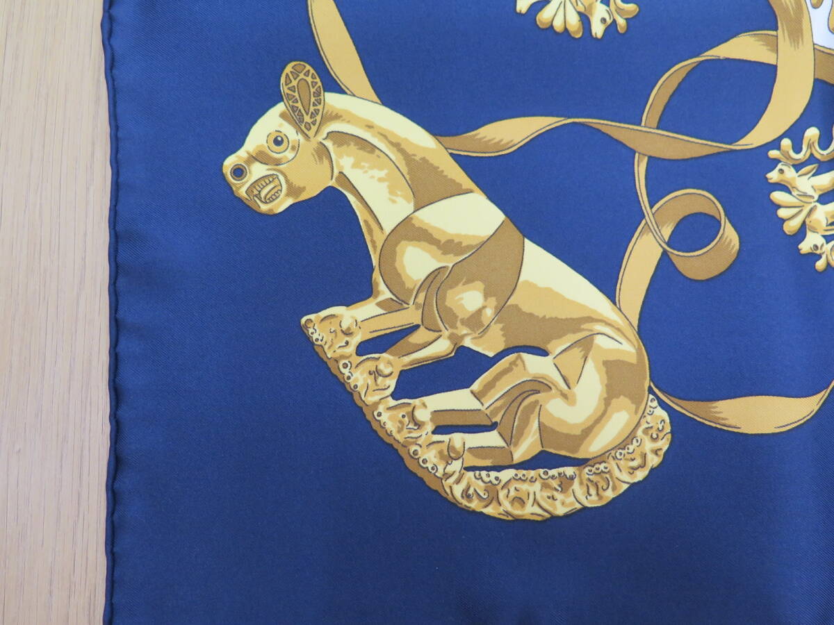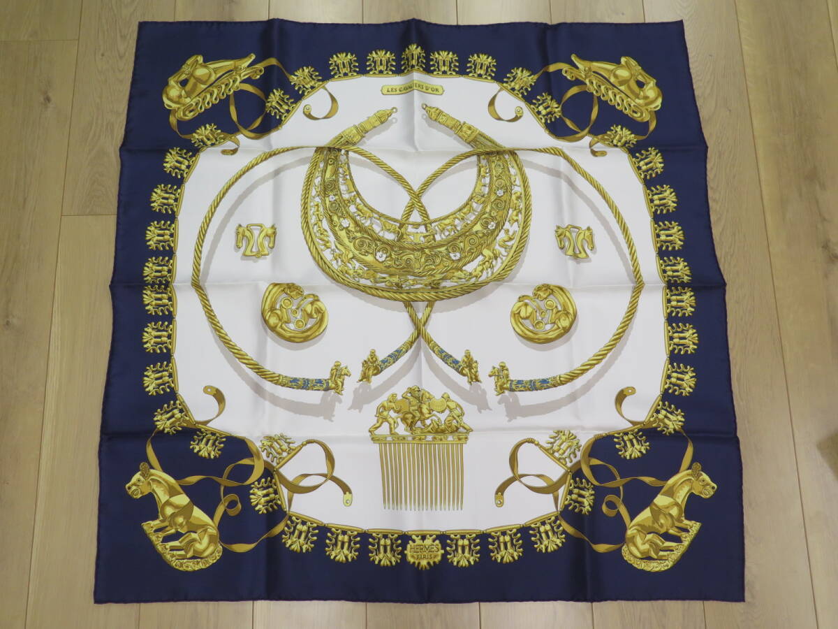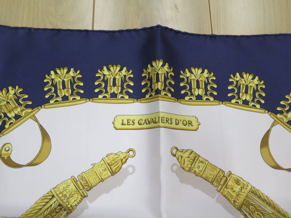 美品(多分未使用)HERMES LES CAVALIERS D’OR エルメス 黄金の騎士 カレ90 シルク100% スカーフ ネイビー系