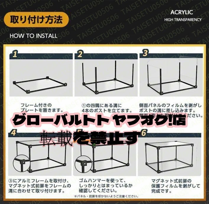 【製品仕様】透明アクリル板*6(面)、アルミニウム合金枠  組立後サイズ【外寸】 はめ込み式だから実内寸約1cm短くなります