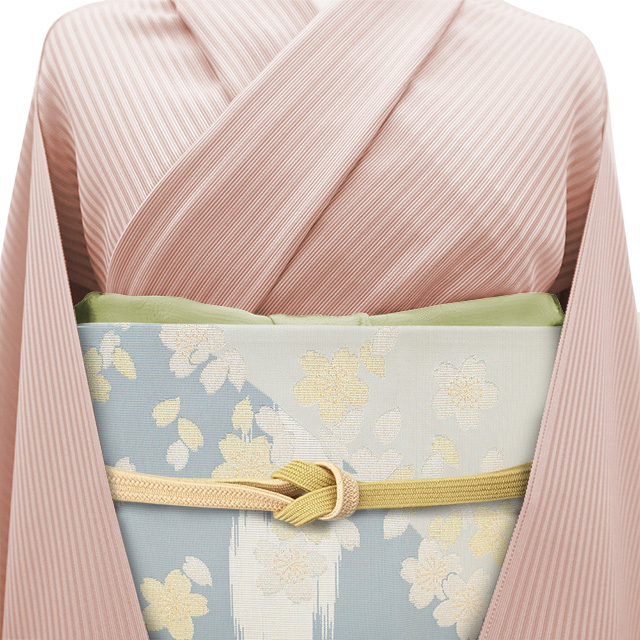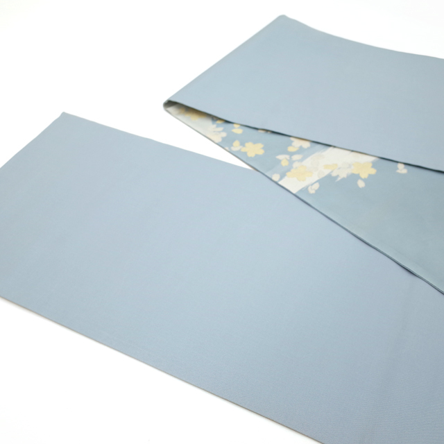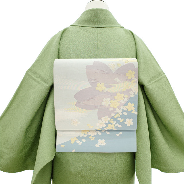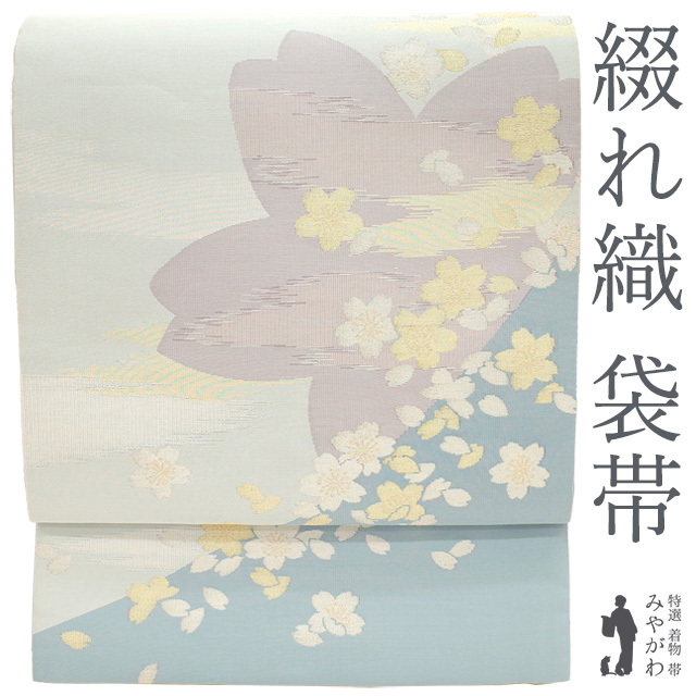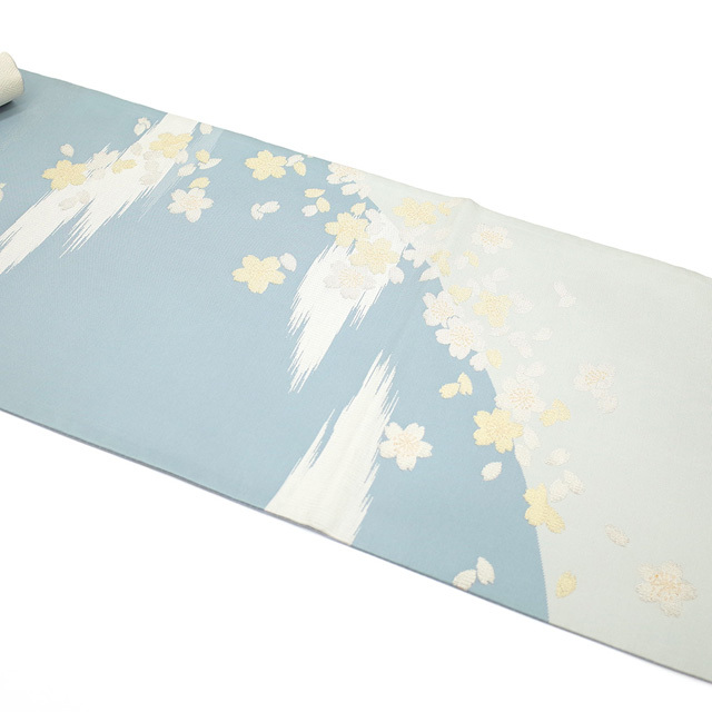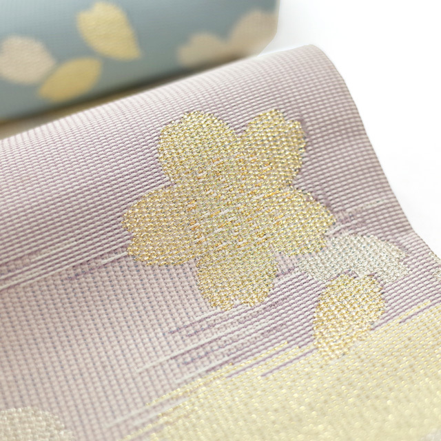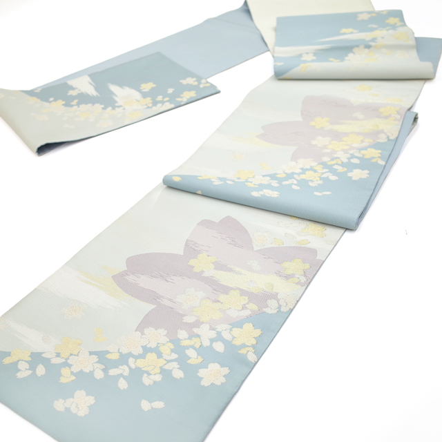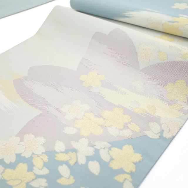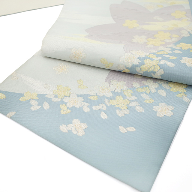 水色の濃淡で霞を表現したような美しい地に、金銀糸を用いて桜や花びらが織り上げられています。