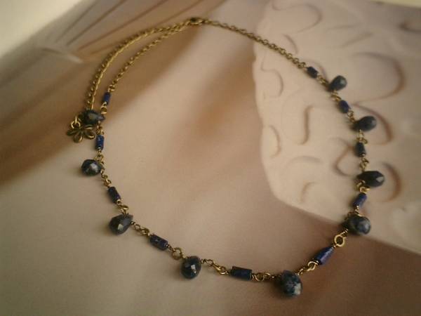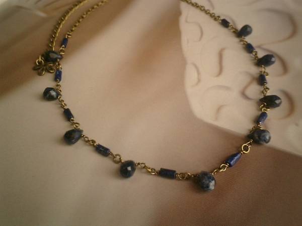 シック・パンクシリーズです♪可憐な人に・・神秘的な藍色のラピスのネックレスです♪さりげなく遊びの入ったデザインです♪キュートなチューブ型やドロップカット型がシック・パンクしています♪ラピスは9×6ミリ位のドロップカットと3×6ミリのチューブ型です♪長さは42センチ+アジャスター13センチで最長55センチ位です♪画像のようにブレスにされても素敵です♪お揃いのネックレスやピアスも出品しています♪♪シンプルで長く着けていただけるデザインを考えて作りました♪ハンドメイドをご理解頂いてノークレーム、ノーリターンでお願いします