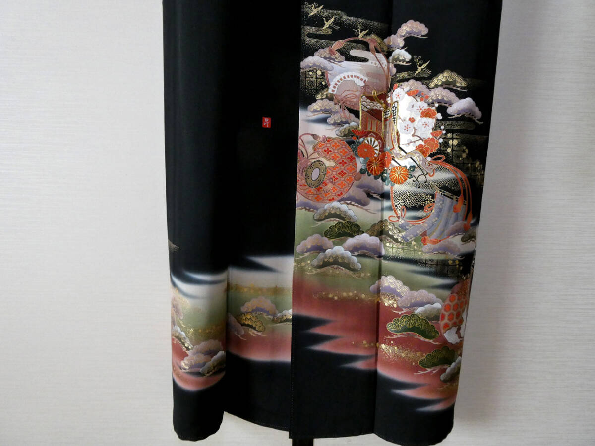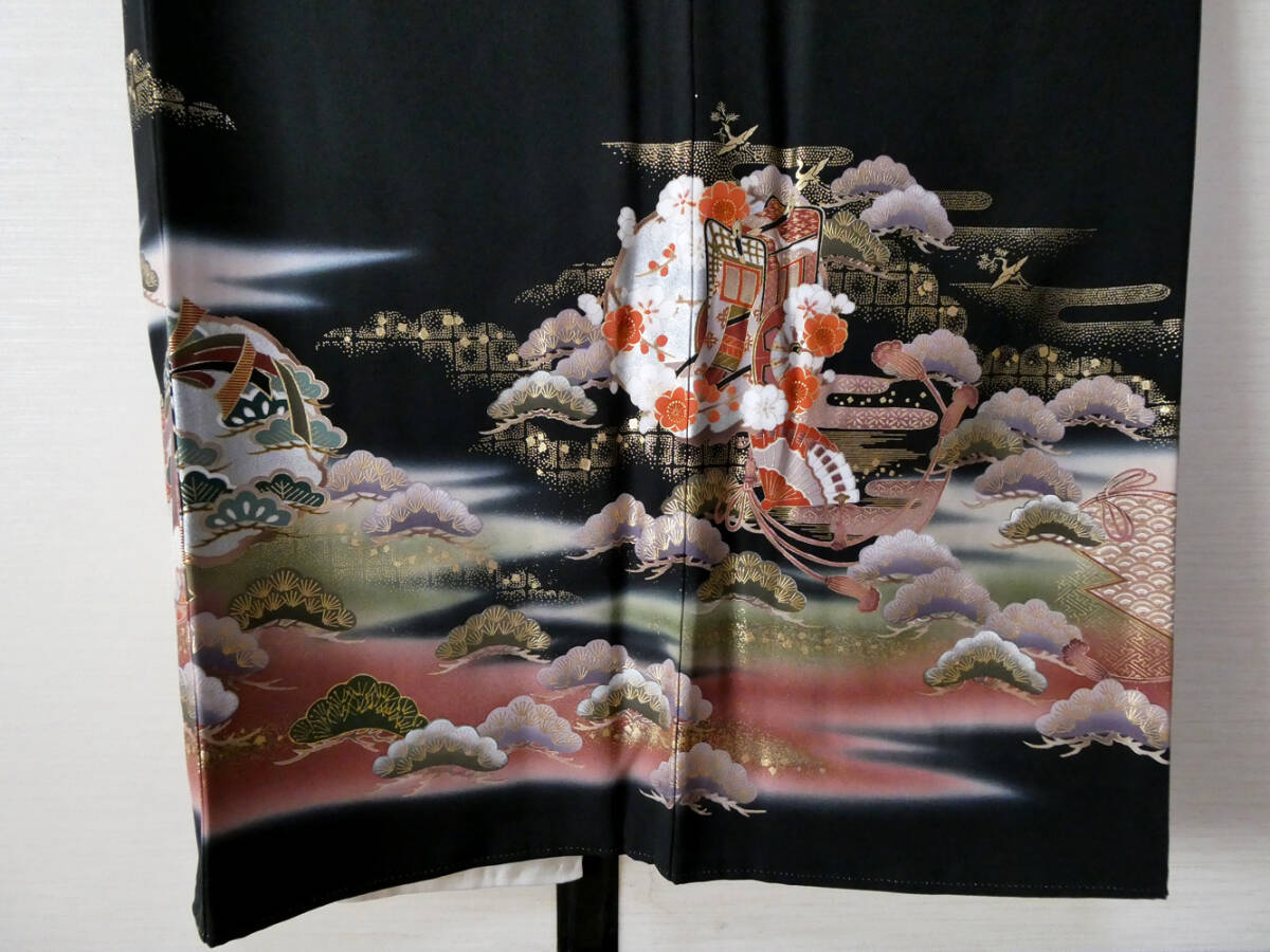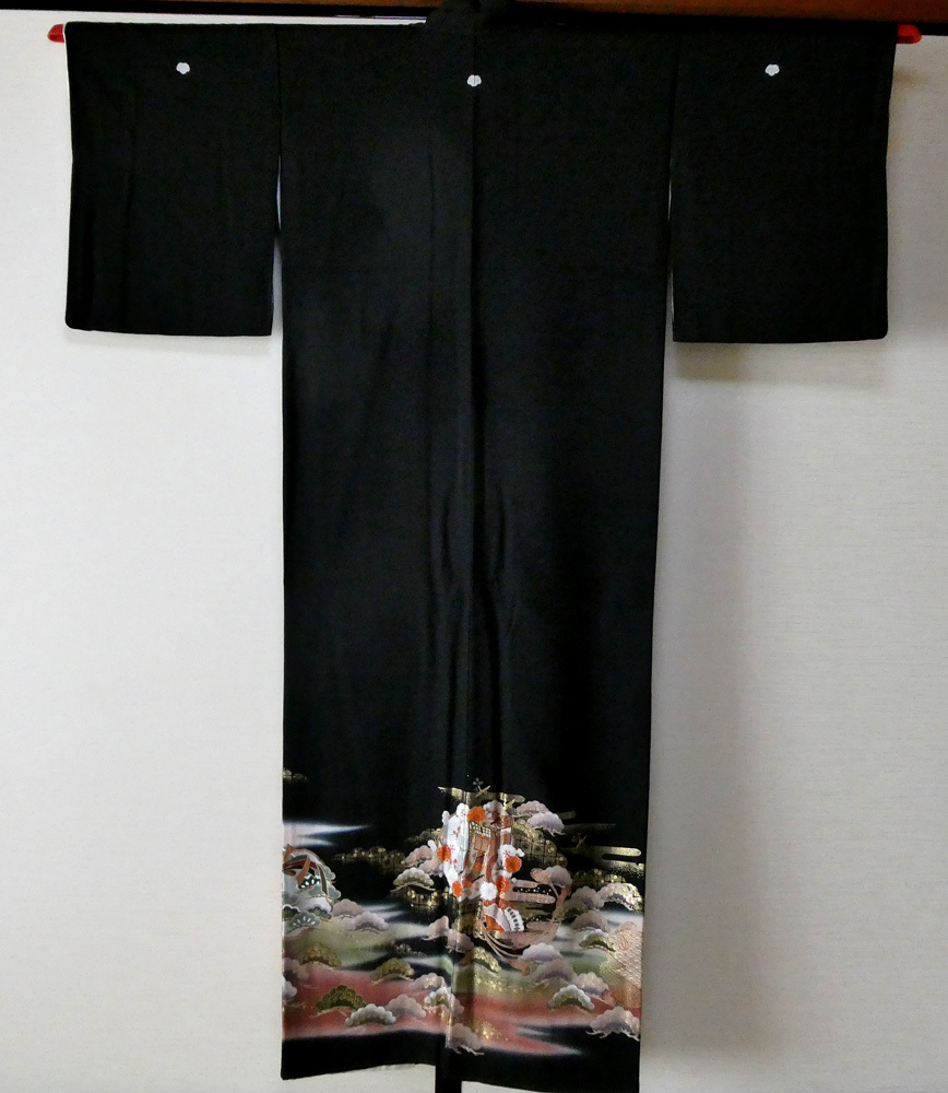 着物サイズ(身長160cmを基準に仕立てていただいています):裄丈(背中心から袖先まで)約63cm、身丈(襟付け根から裾まで)約157cm、後ろ幅約60cm