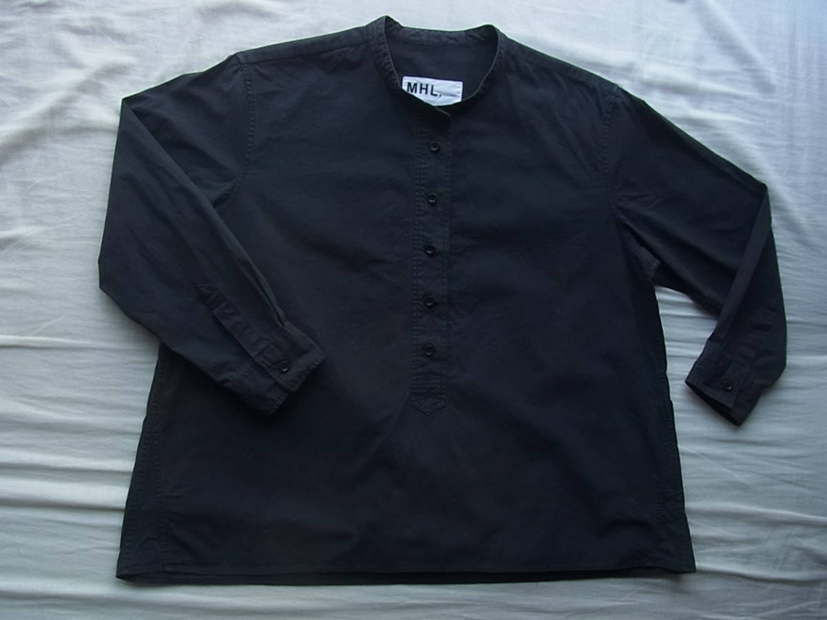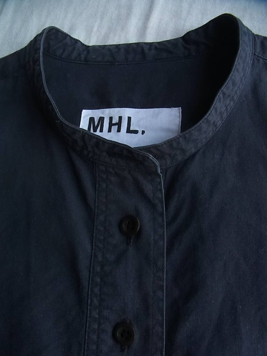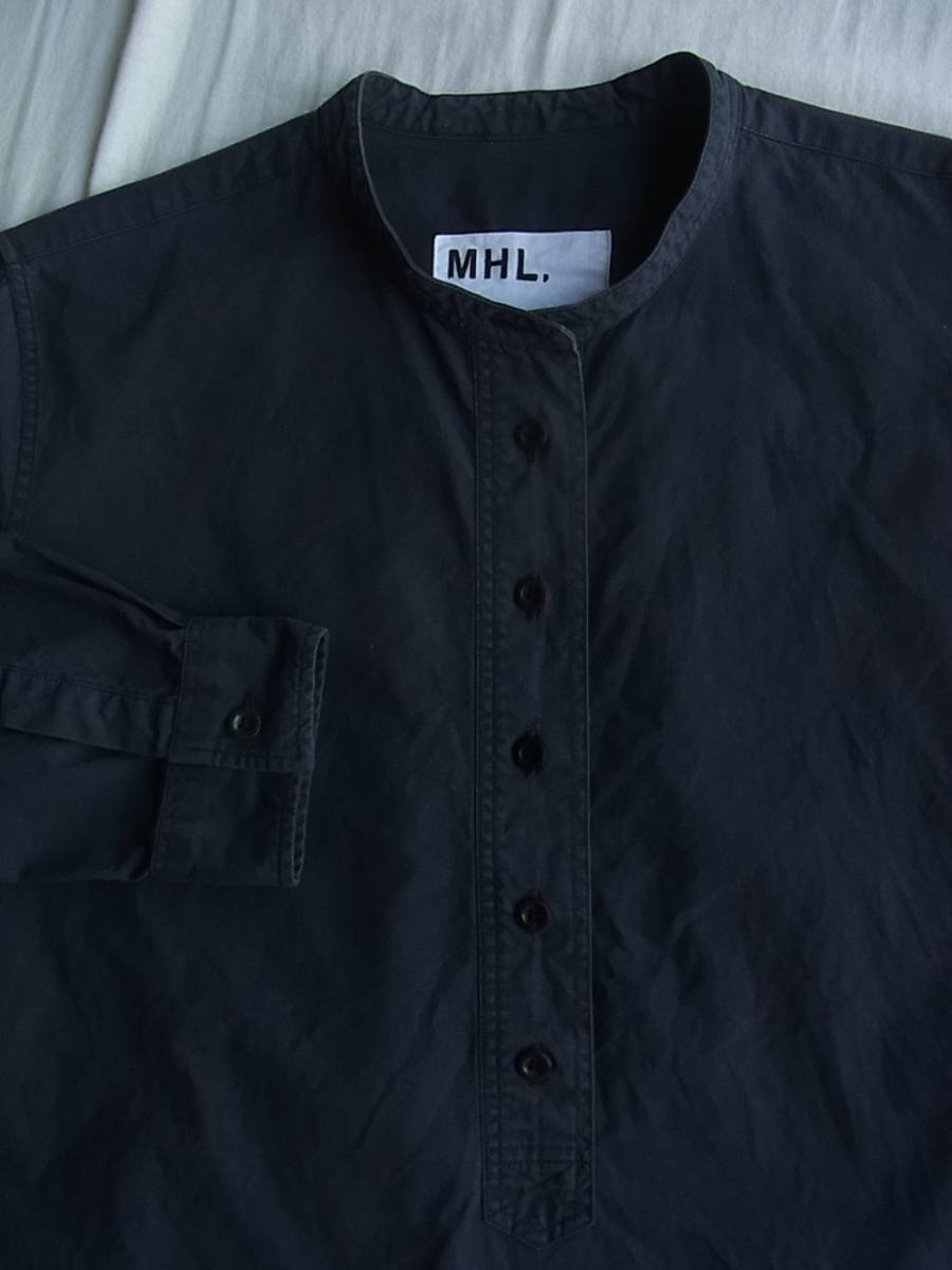 M H L,  マーガレットハウエルのコットン素材でAライン、ワイドシルエットの七分袖バンドカラーシャツになります。USEDで着用感と濃色の為多少の色褪せは御座いますが、それ以外には特に目立ったダメージ等は御座いません。