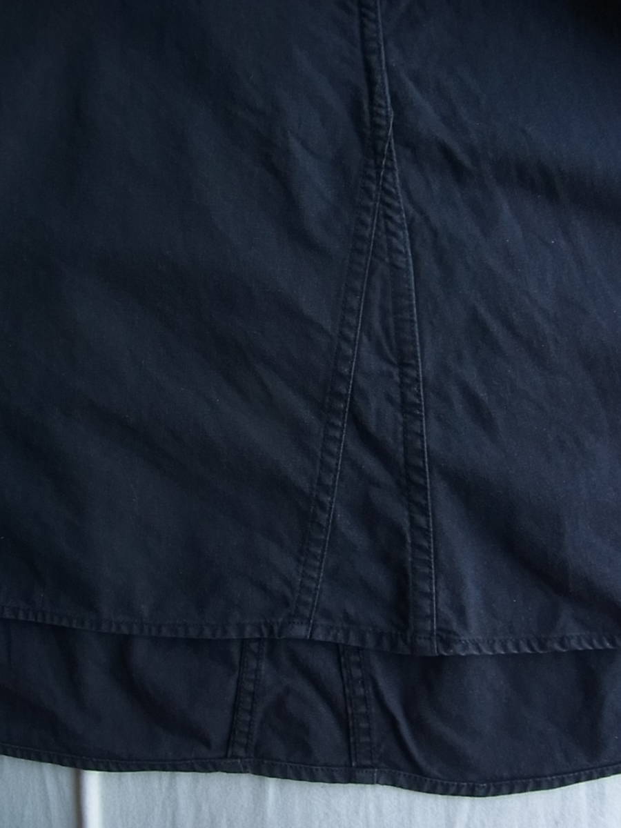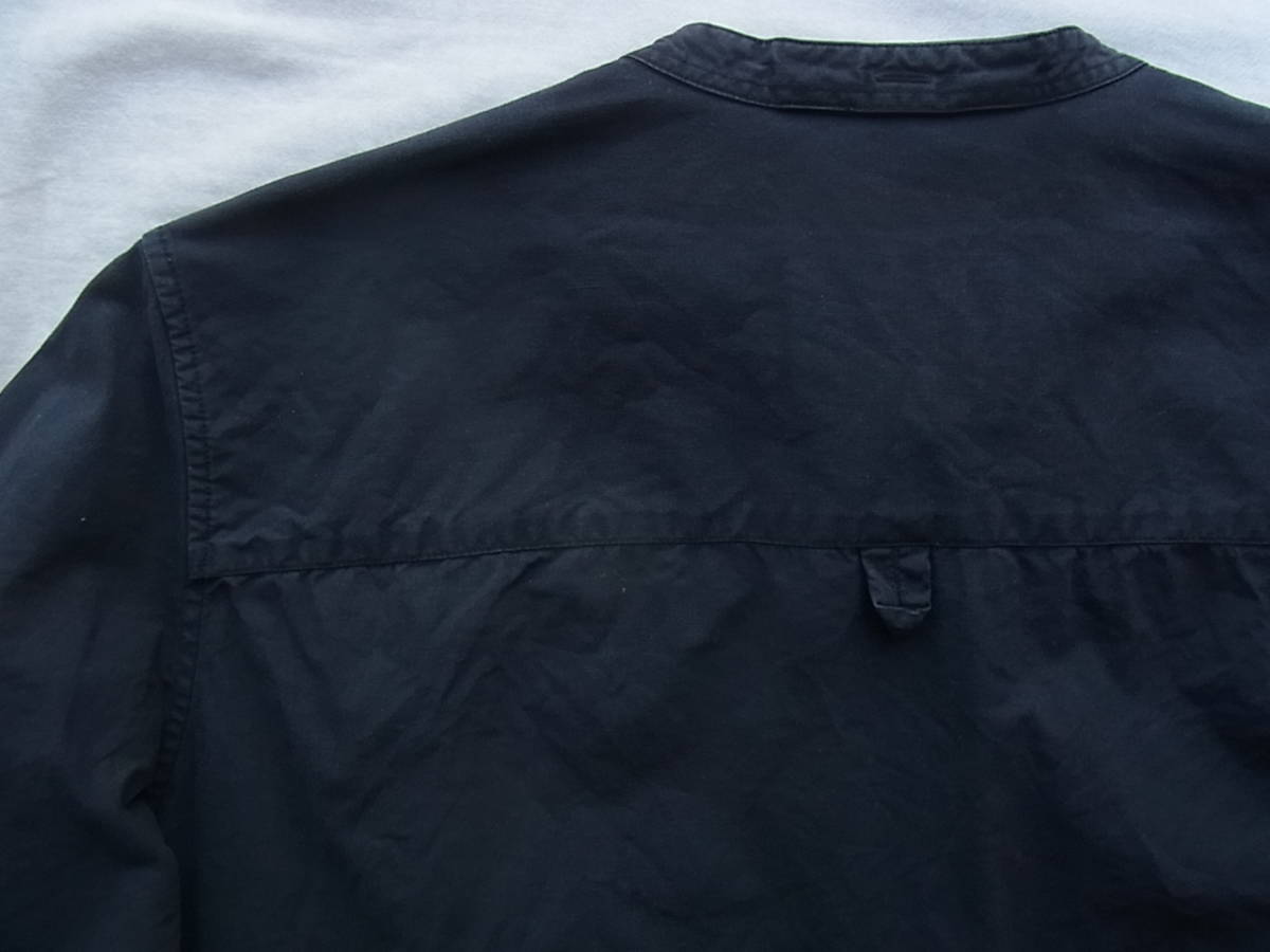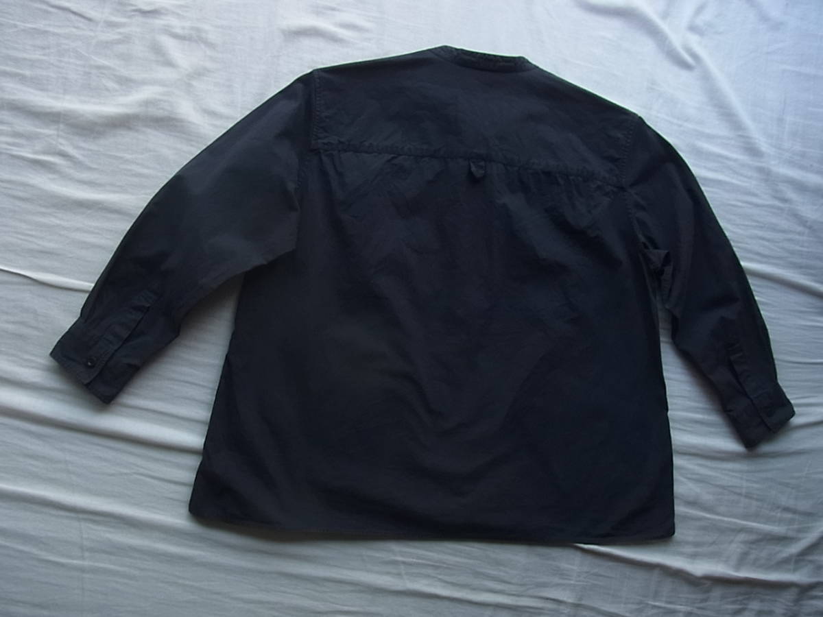 M H L,  マーガレットハウエルのコットン素材でAライン、ワイドシルエットの七分袖バンドカラーシャツになります。USEDで着用感と濃色の為多少の色褪せは御座いますが、それ以外には特に目立ったダメージ等は御座いません。