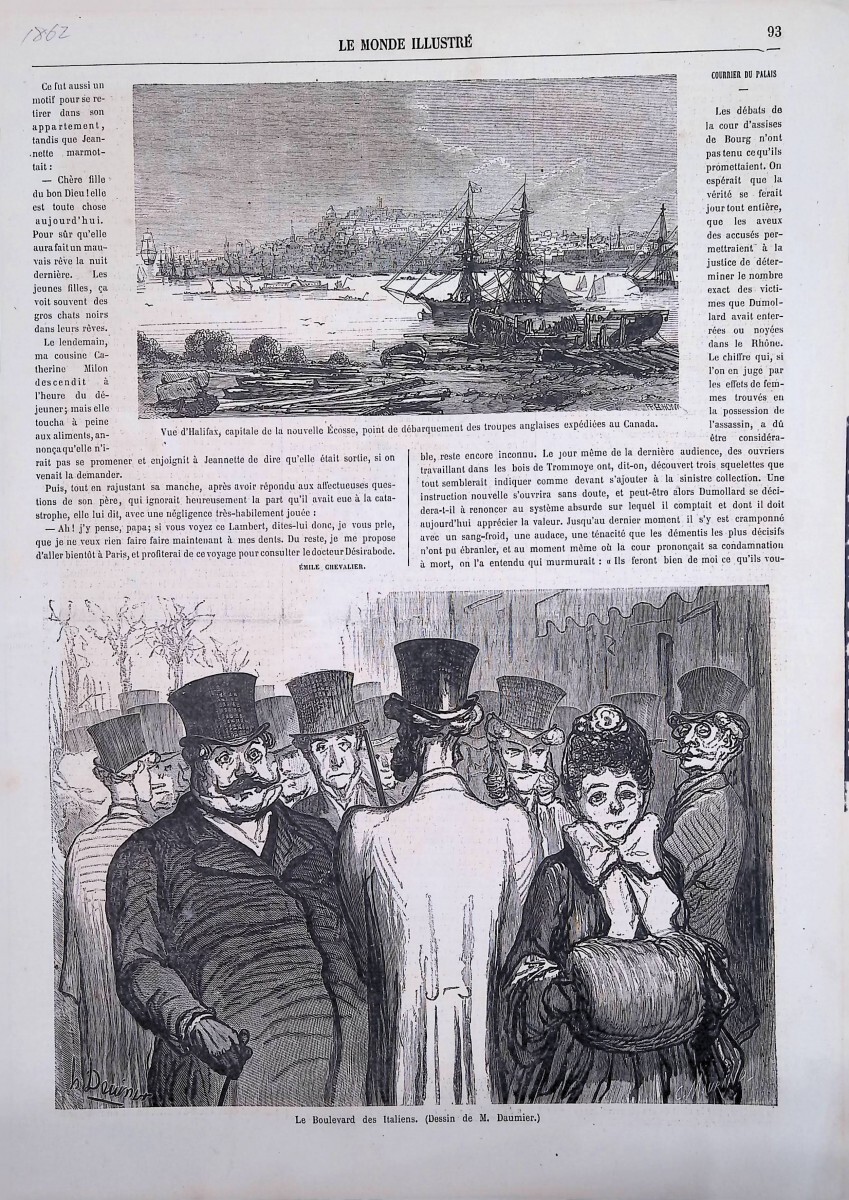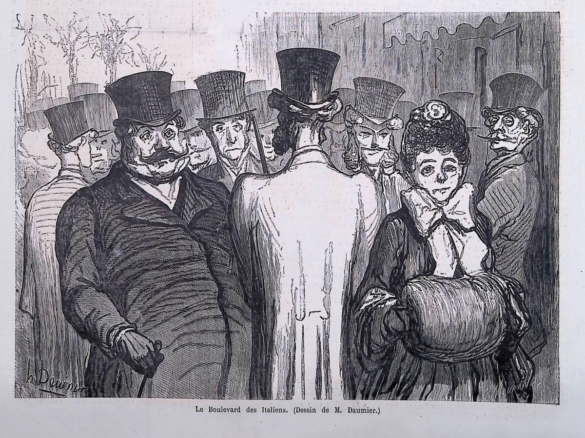 Honore Daumier の作品は、1960年代にパリで刊行される新聞に掲載されるようになります。これは、当時の新聞の一葉です。オリジナルの木口木版画です。 新聞紙のサイズは26cmx36.7cmです。その半分くらいの部分がドーミエの版画です。少し古色が出ていますが、状態は良いと思います。版上にサインがあります。ドーミエの版画のうち、新聞に掲載されたものは、殆ど残っていません。非常に珍しいものです。