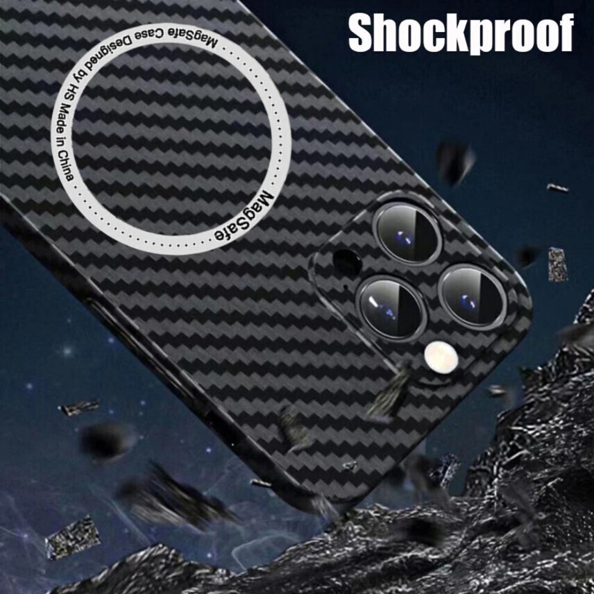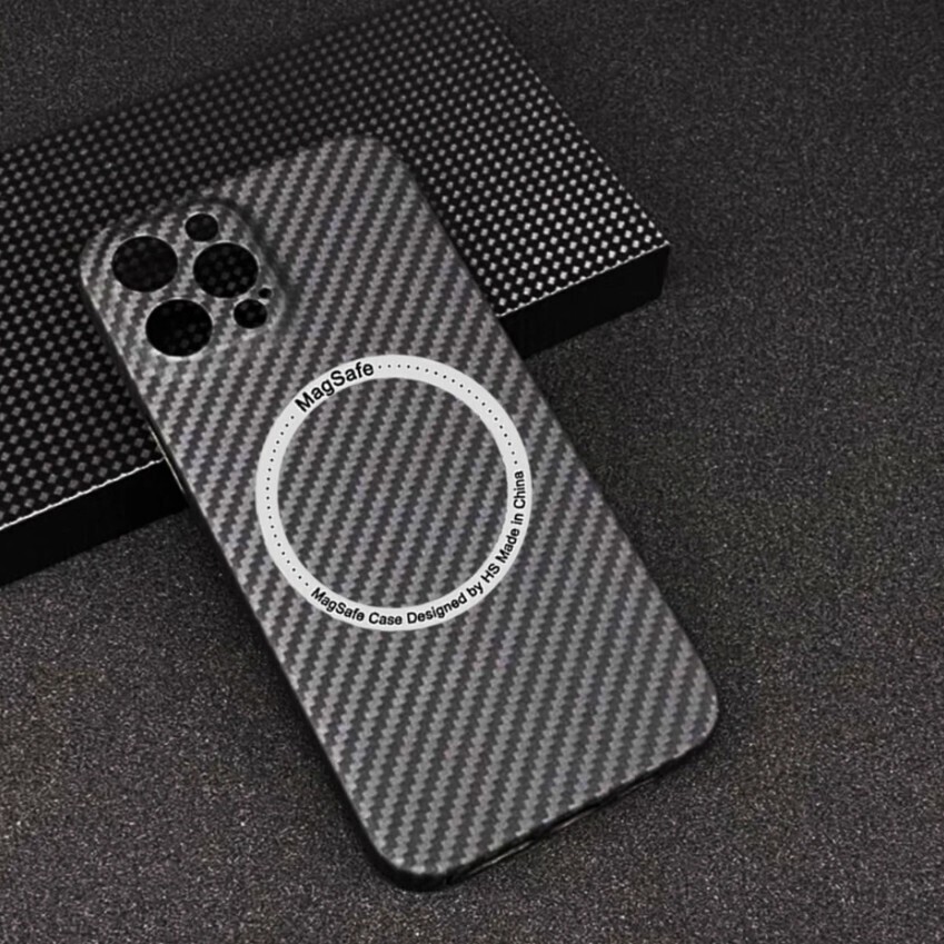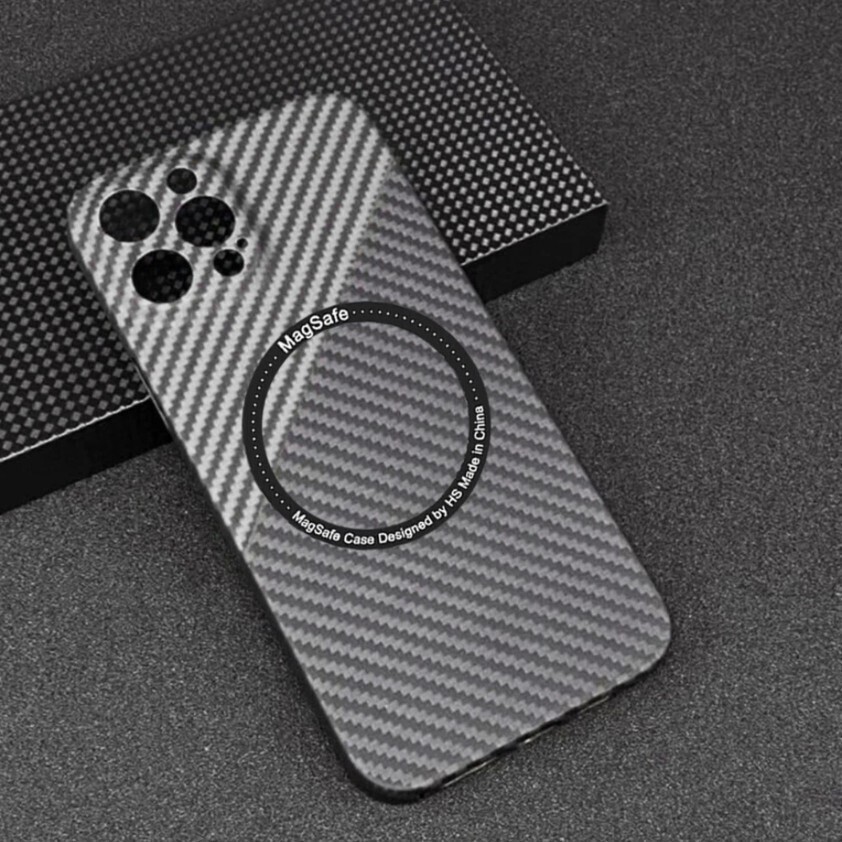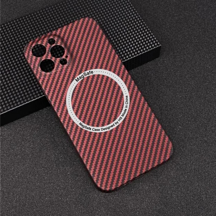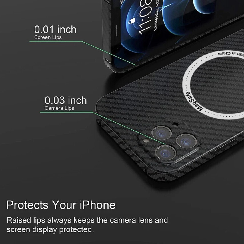 MagSafeアクセサリーに対応。ファッショナブルなカーボンファイバーの質感とコーティングによるつや消し加工で、より快適な手触り。0.8mmの超薄型デザインで、スマートな外観。