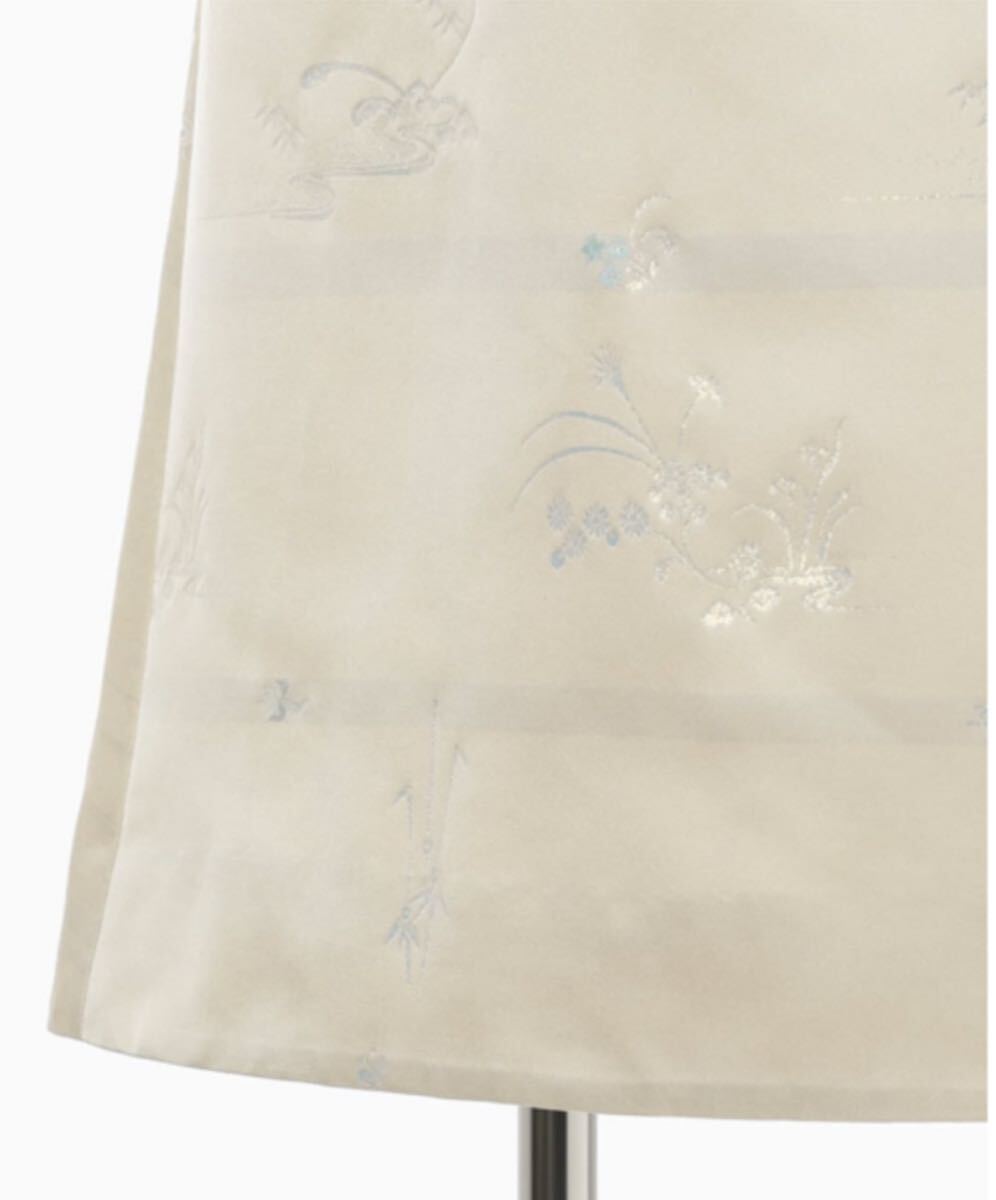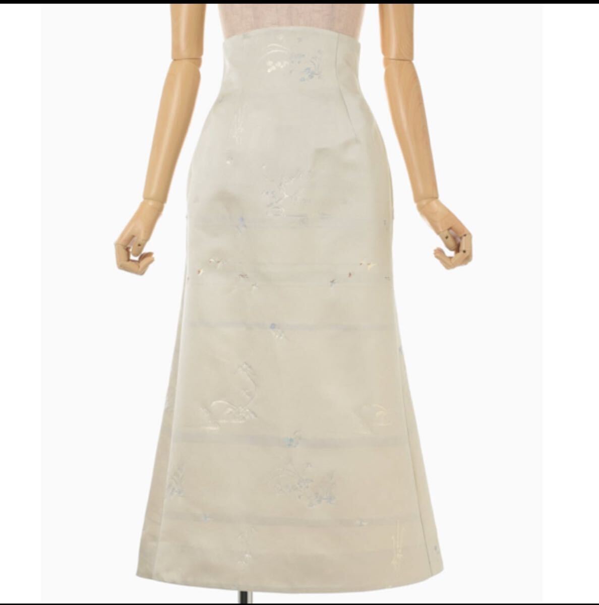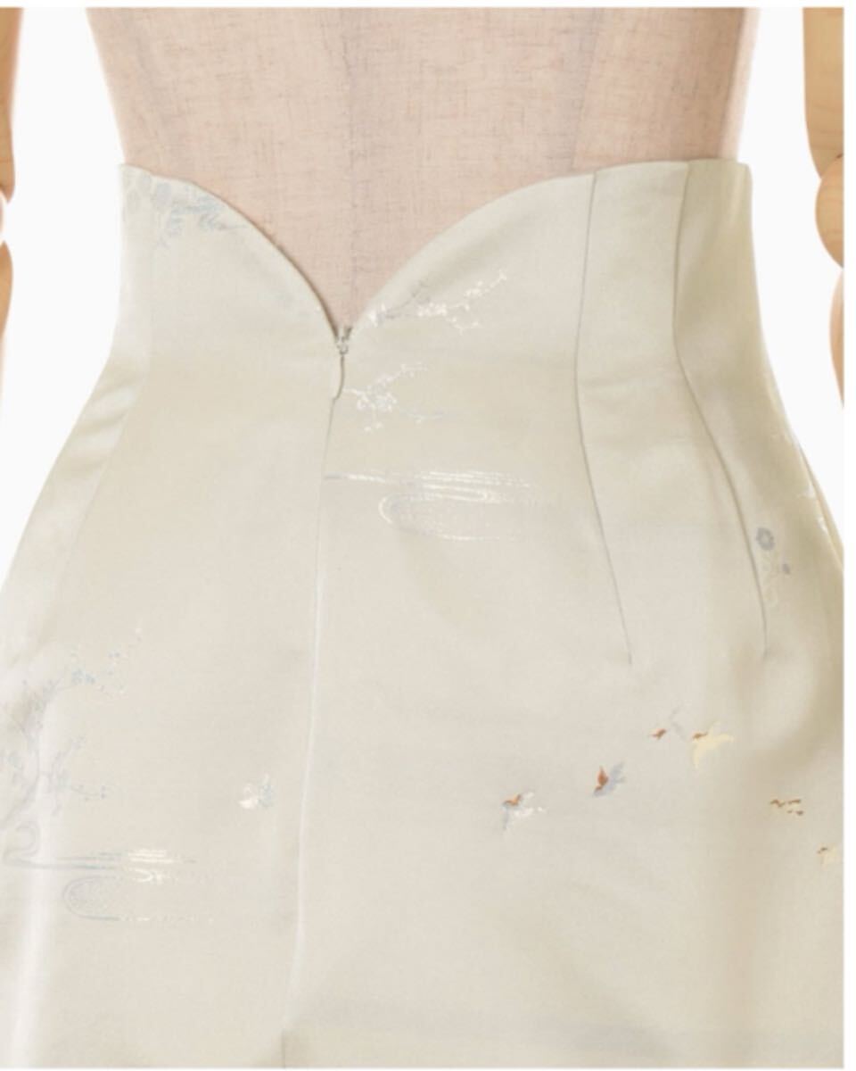 高密度に折り上げたサテン地は漆のようなマットな光沢が生まれ上品な艶を醸し出す。角度によって色が変化して見えるオーロラ糸を使い、花鳥風月柄を螺鈿細工に使われる夜光貝のような輝きで再現。繊細な表情をみせるスカートは、身体を立体的に見せるヒップの切り替えから裾にかけてのフレアシルエットが軽やかなAラインを作り出し、ハイウエストのデザインがウエストをすっきりと引き締め、スタイルアップも叶える1着。