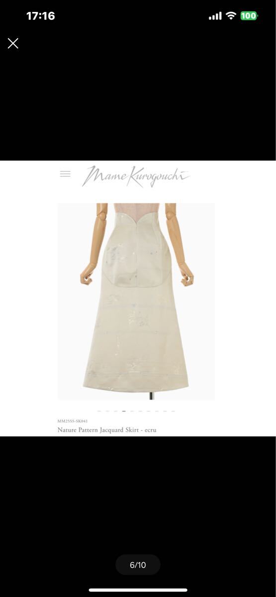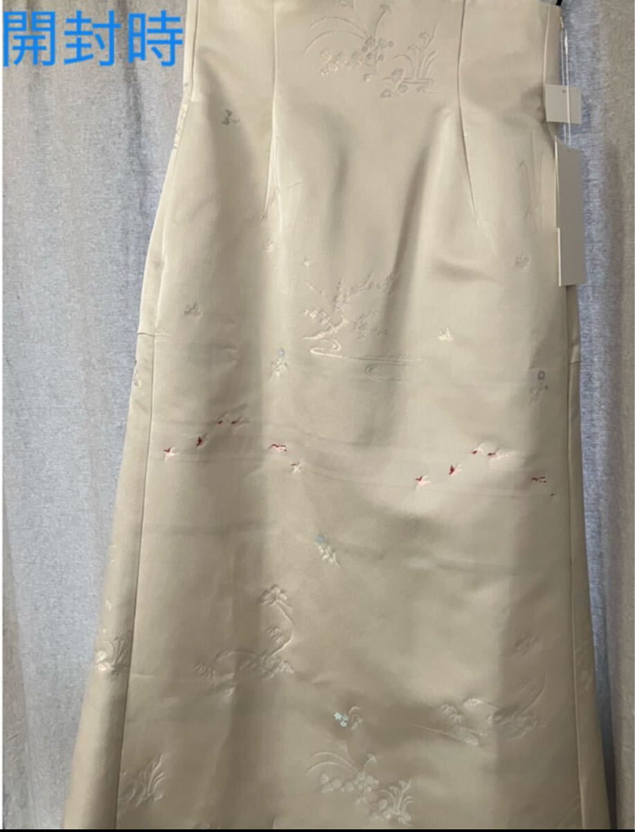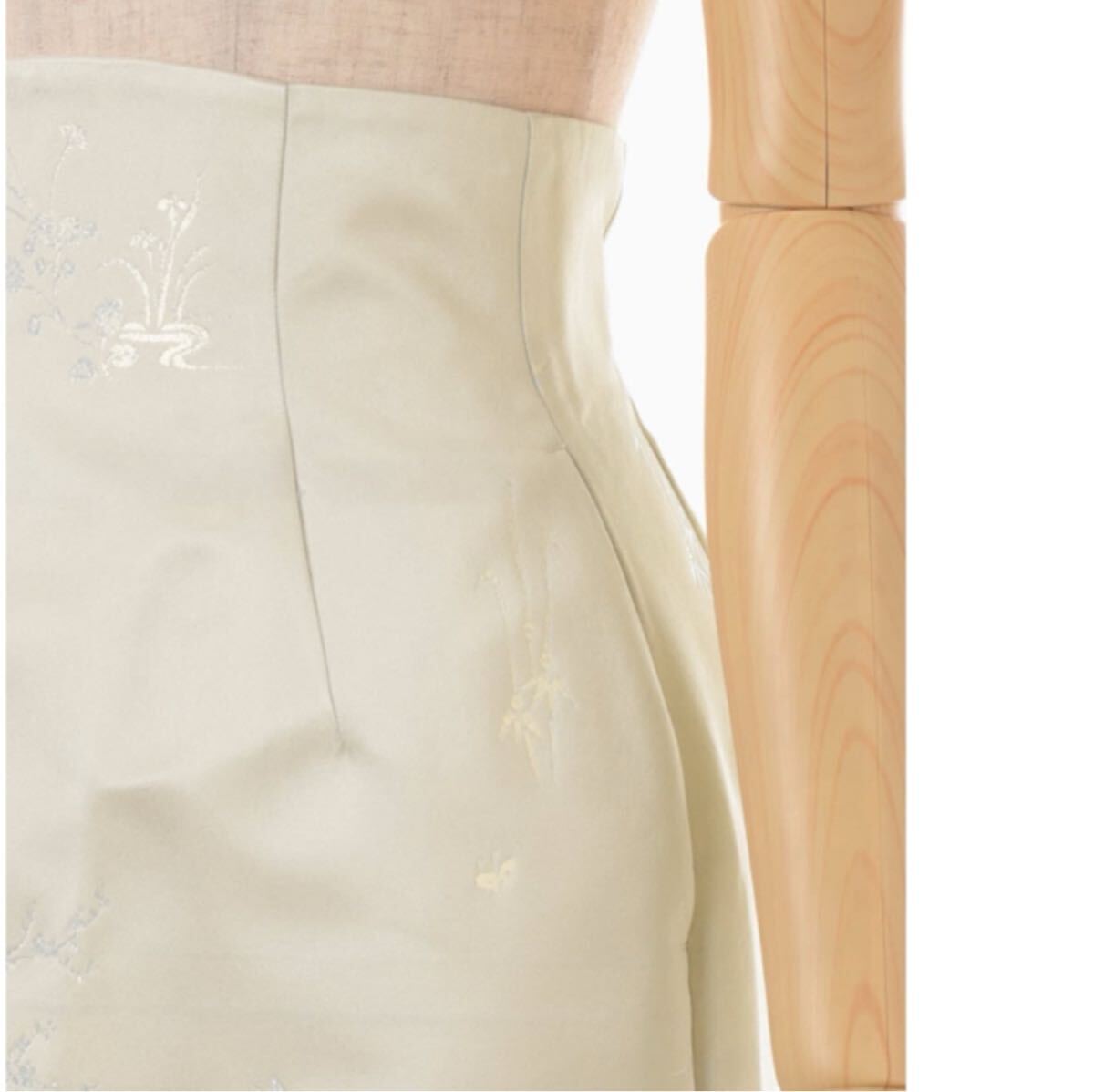 高密度に折り上げたサテン地は漆のようなマットな光沢が生まれ上品な艶を醸し出す。角度によって色が変化して見えるオーロラ糸を使い、花鳥風月柄を螺鈿細工に使われる夜光貝のような輝きで再現。繊細な表情をみせるスカートは、身体を立体的に見せるヒップの切り替えから裾にかけてのフレアシルエットが軽やかなAラインを作り出し、ハイウエストのデザインがウエストをすっきりと引き締め、スタイルアップも叶える1着。