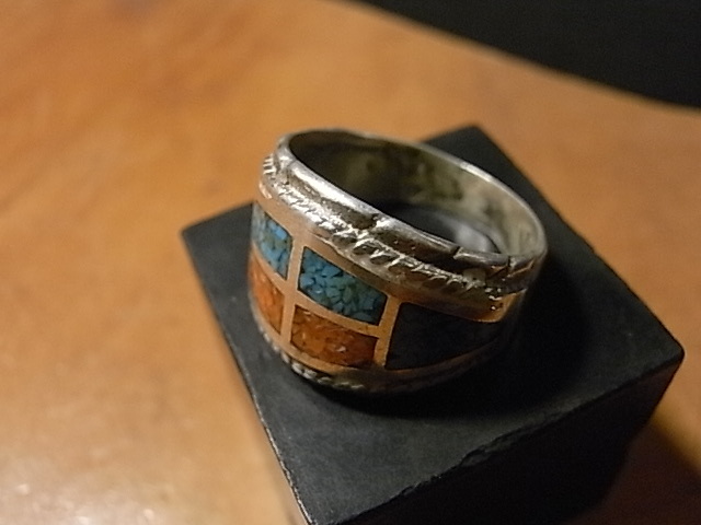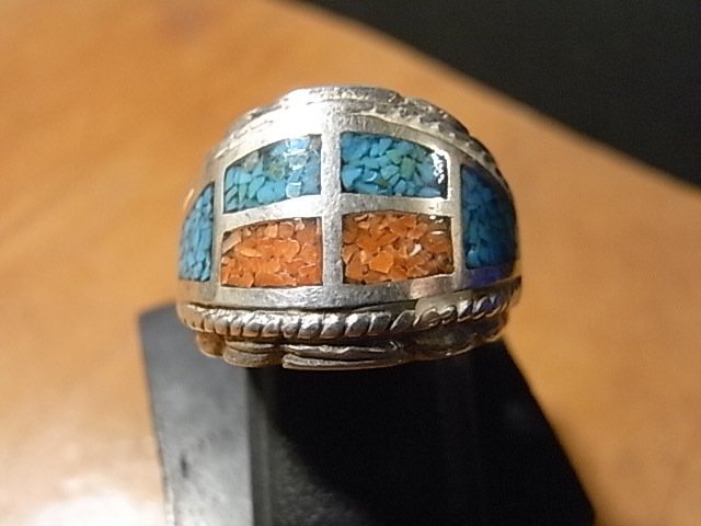 こちらは、1970~80年代のスターリングシルバー製のキャストリングで、ターコイズ&コーラルのチップインレイが施されています。