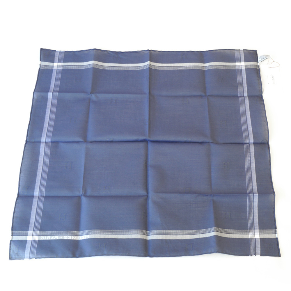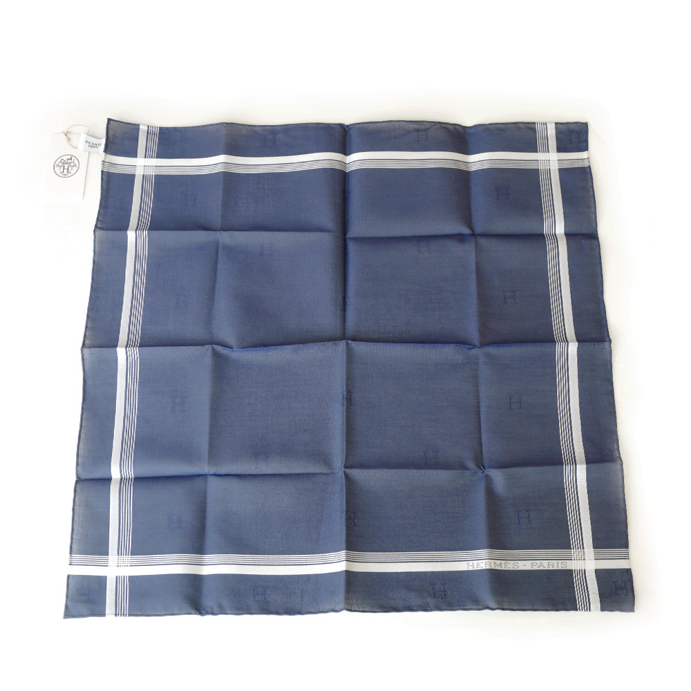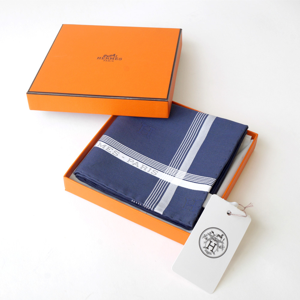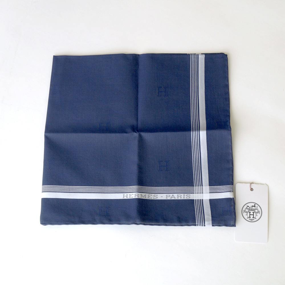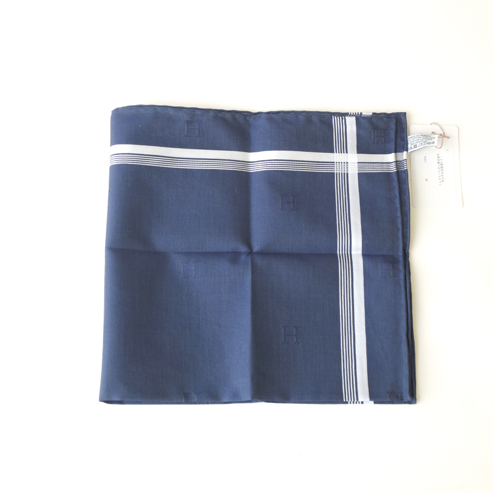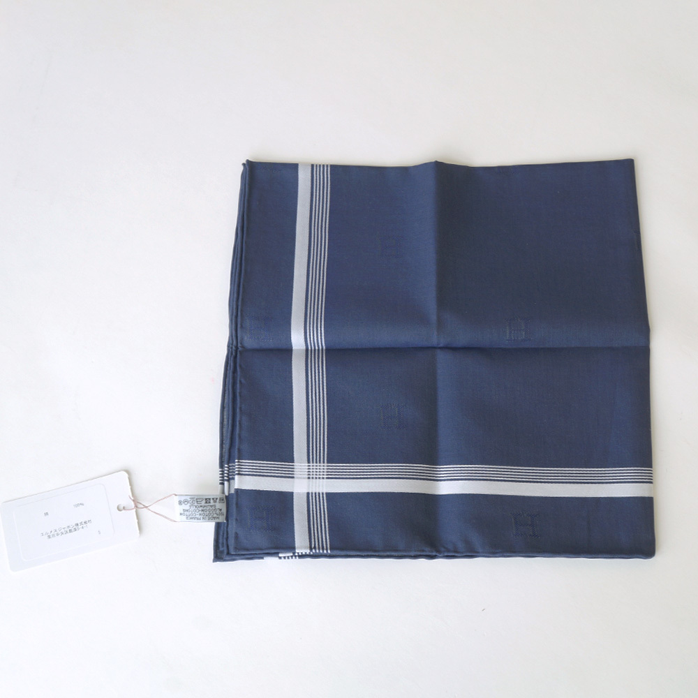 【栄】エルメス Hロゴ ハンカチ ブルー ネイビー 紺 青 メンズ ポケットチーフ コットン100% スカーフ 小物 その他 箱