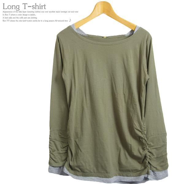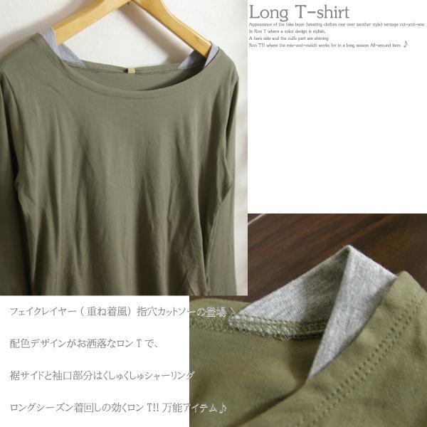M ロンT 指穴 ロング丈 長袖 重ね着風 無地 配色/カーキ 新品