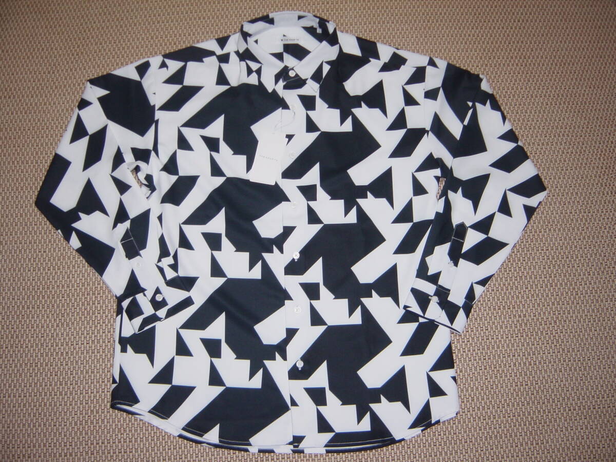 新品未使用のタケオキクチドットプリント長袖シャツです。カラーはホワイト×ブラック、肌触りの良いシャツです。また、ジオメトリックデザインでスタイリッシュな仕上がりとなっています。サイズはL、丈約76cm 肩幅約55cm 袖丈約60cmです。