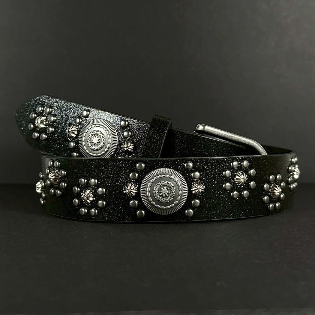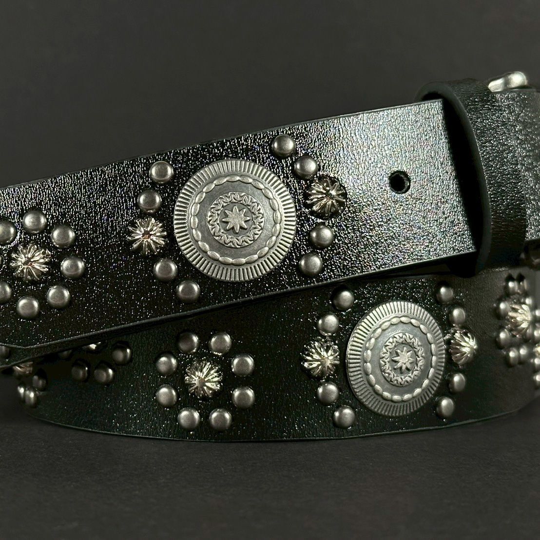 タフな風合いのレザーに、スタッズとコンチョを絶妙なバランスで配置した、存在感ある一本です(*^^)v