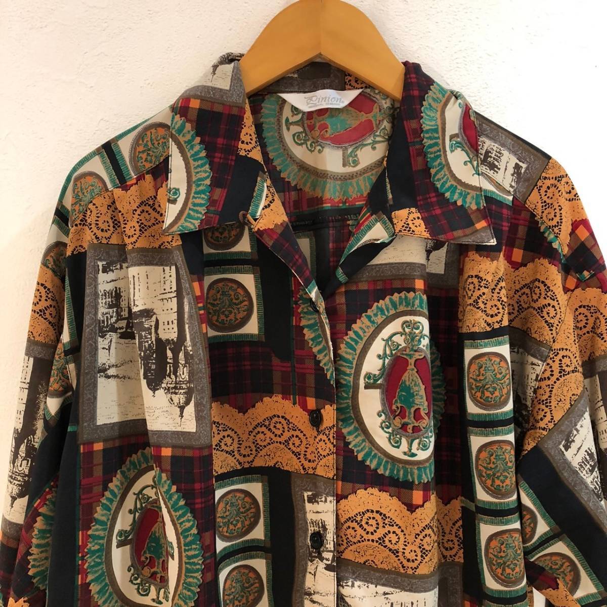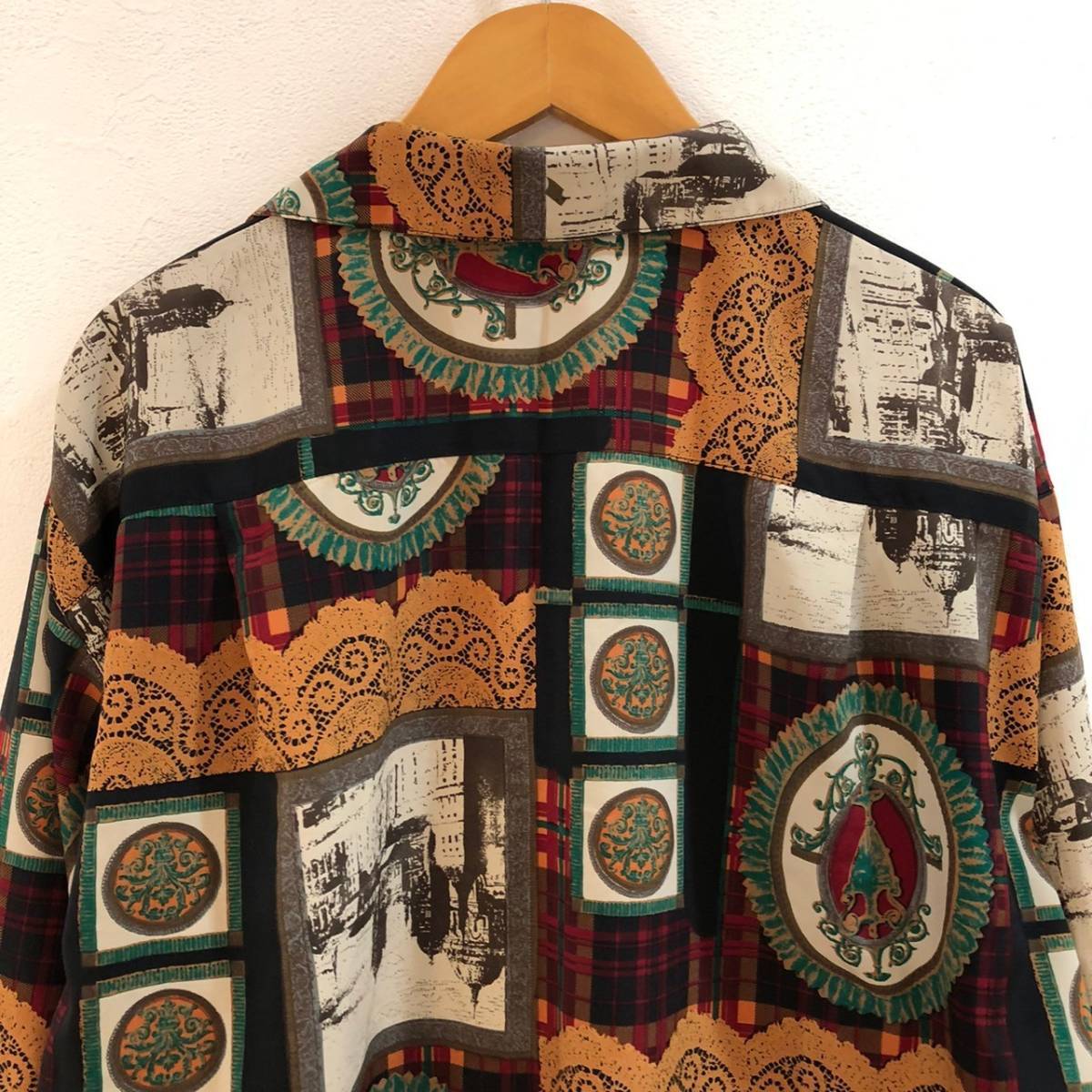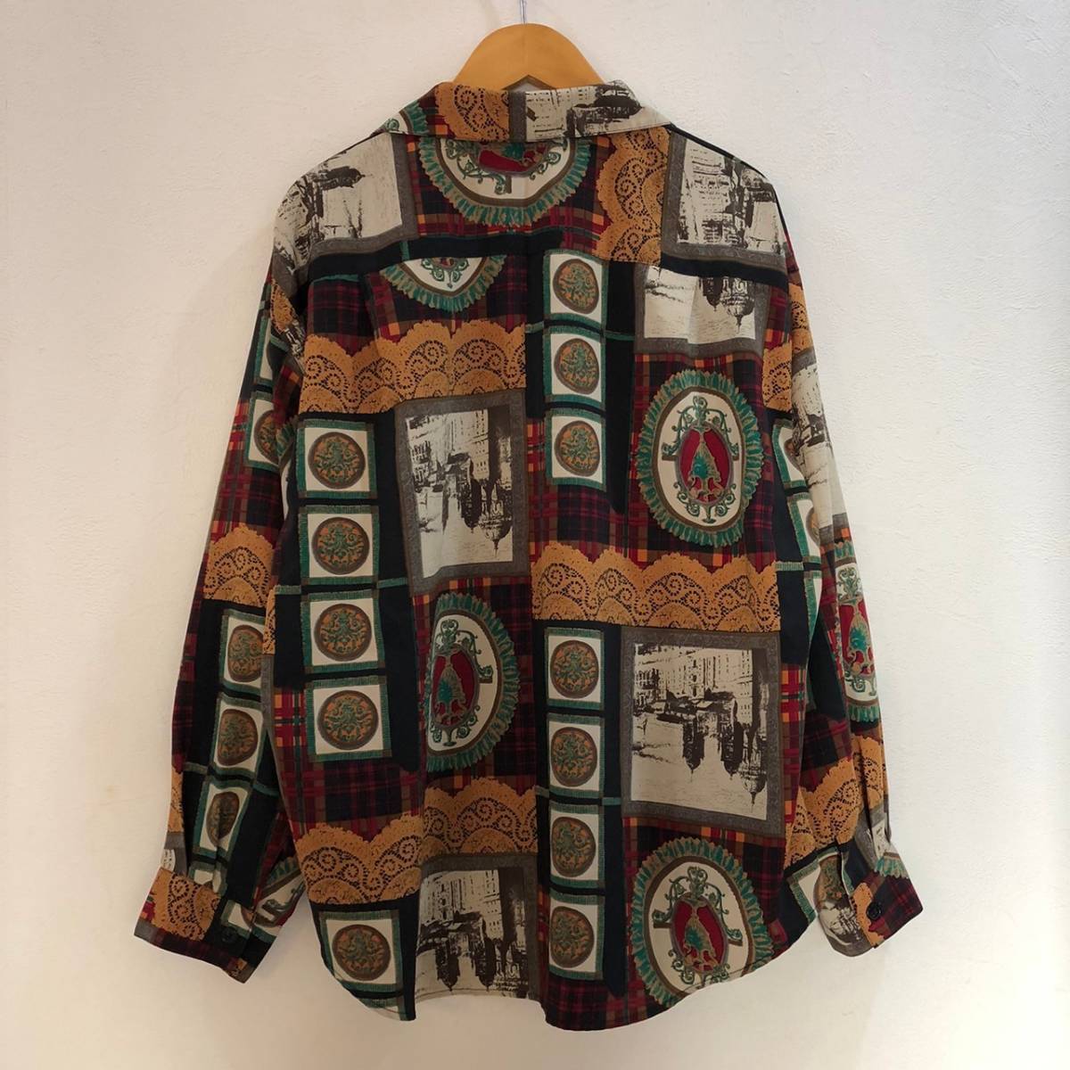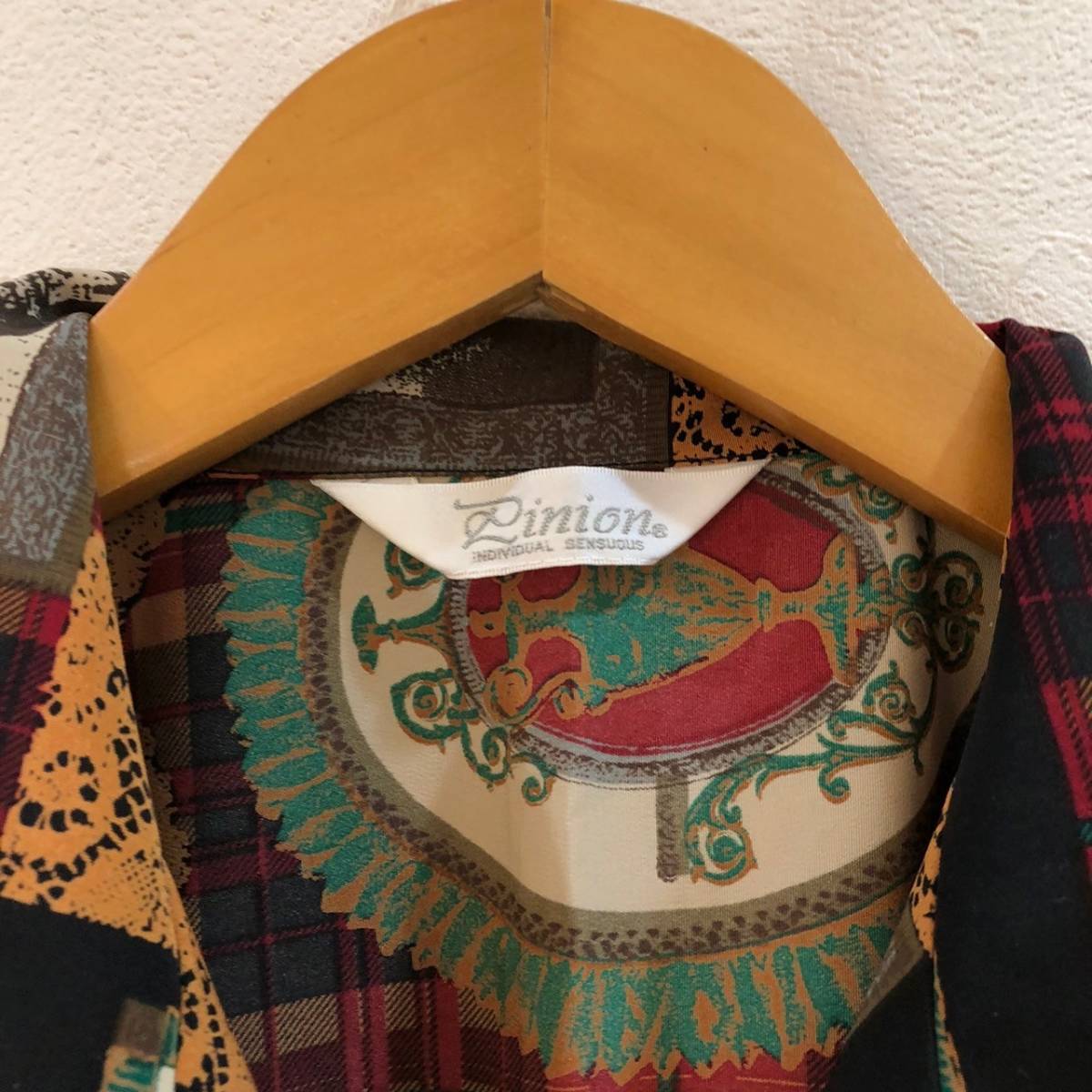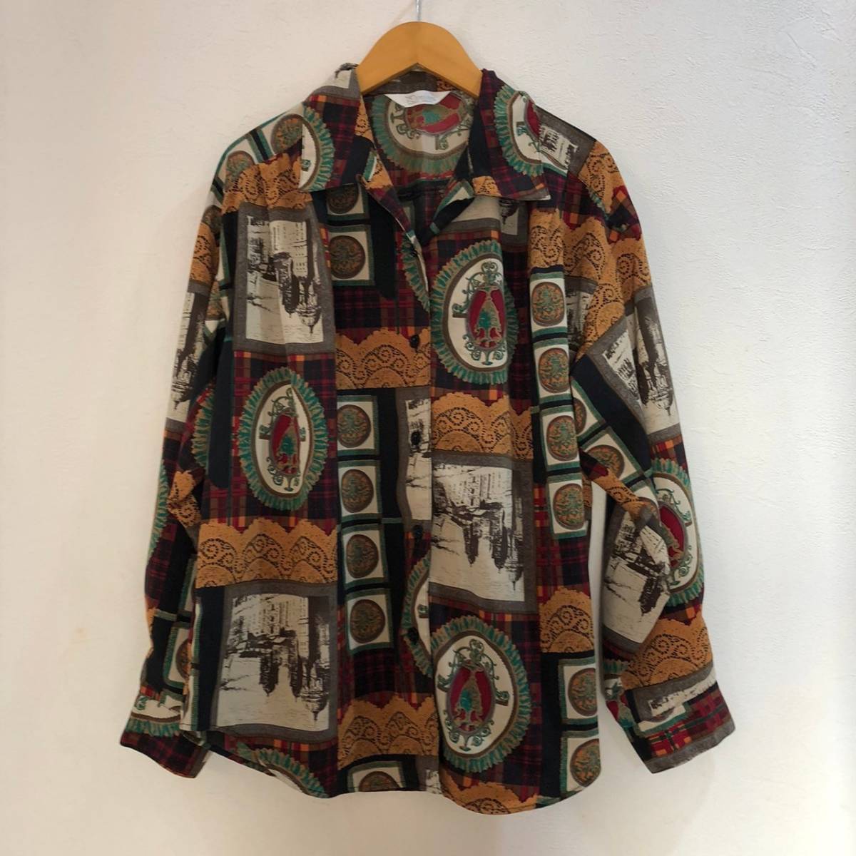 商品: Pinion/ 長袖 総柄ポリシャツ ブラック ブラウン レッド レディース F