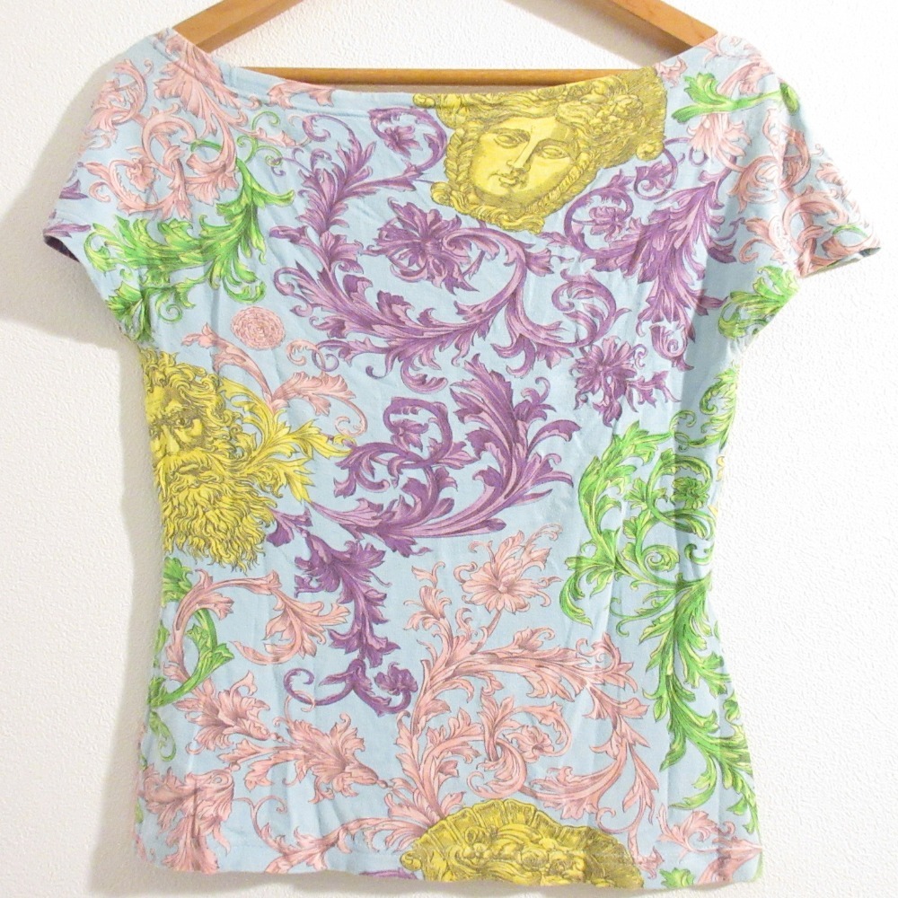美品 VERSACE JEANS COUTURE ヴェルサーチジーンズクチュール バロック柄 フレンチスリーブ Vネック カットソー S ブルー系