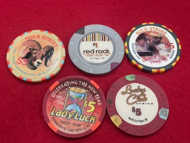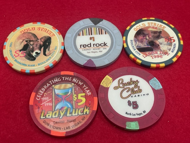 C-34現状品 チップ 入手困難 本場海外 ラスベガスなど ヴィンテージ カジノチップ $5など ポーカーチップ ゴルフマーカー5枚セット
