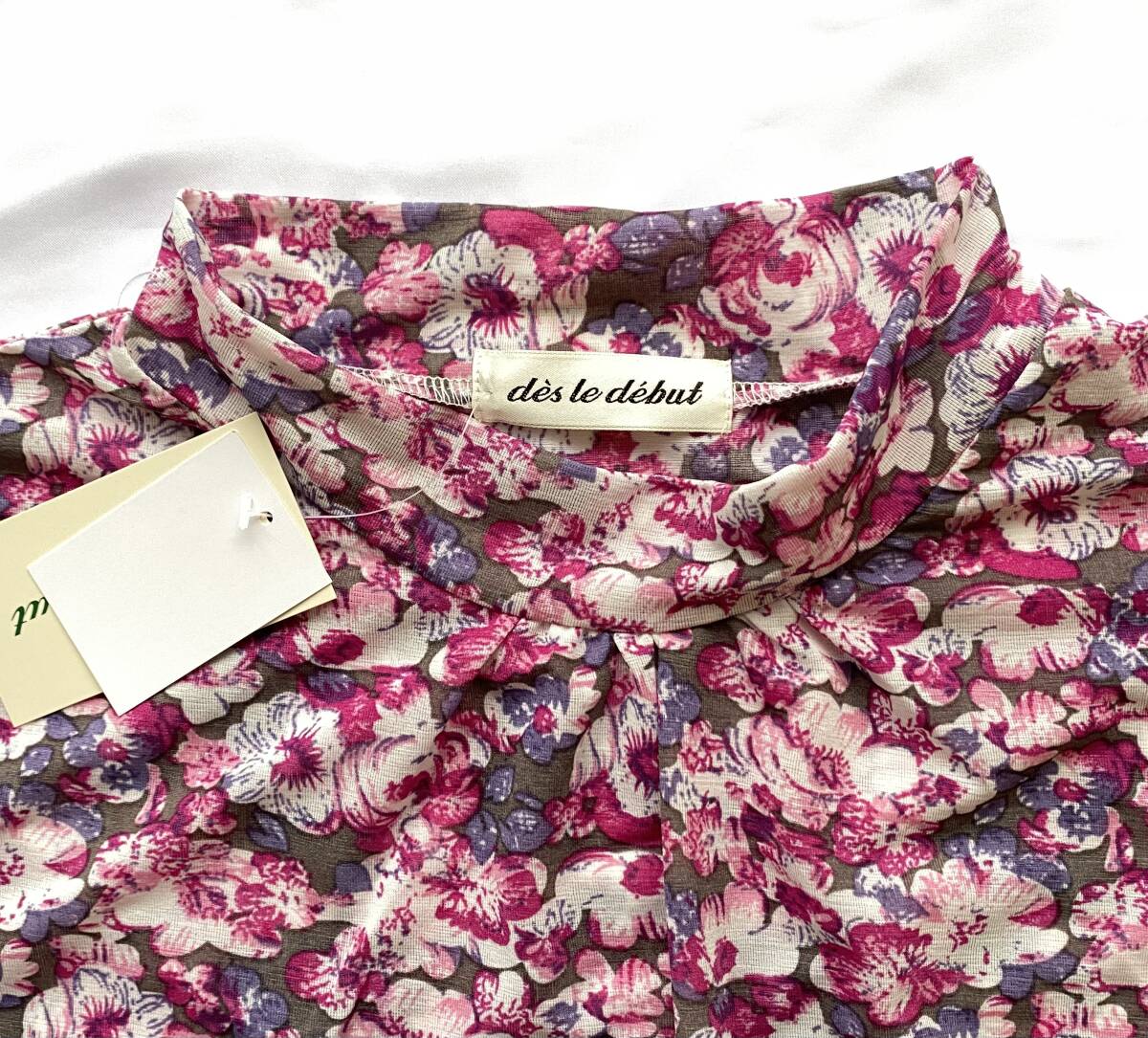 首元が少しだけハイネックになっていて、そこからギャザーがとられていて下にふわっと広がる感じです。