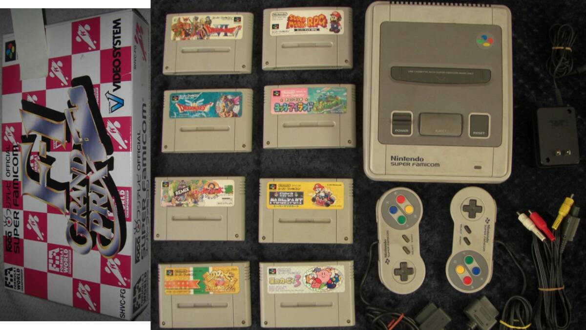 ★任天堂 スーパーファミコン★SHVC-001本体一式+ゲームソフト付属◇F1グランプリ スーパーマリオ ドラクエ ソフト等9個☆中古品