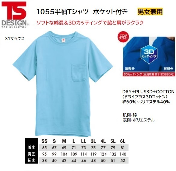 [ネコポス発送/1枚]★TSDESIGN 1055半袖Tシャツ ポケット付き【31サックス・LLサイズ】定価3000程度の品、即決880円!!
