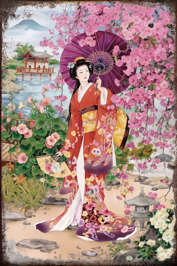 艶やかな和傘と美しい着物姿の女性、日本庭園や満開の花々が織りなす優雅な世界を描いたブリキ看板です。