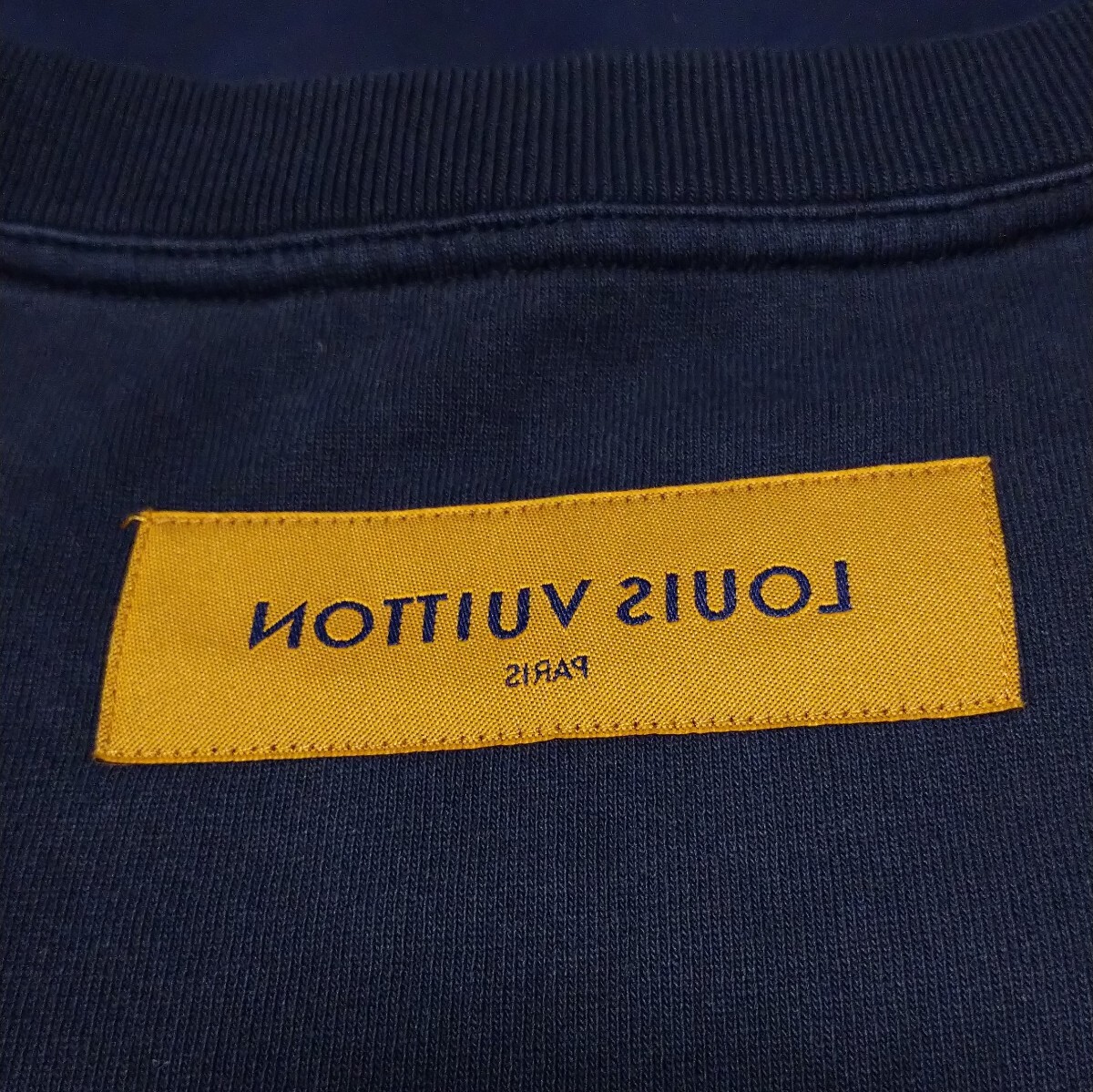 背面側の襟元にはルイヴィトンのロゴが裏返しになった生地が取り付けられています。