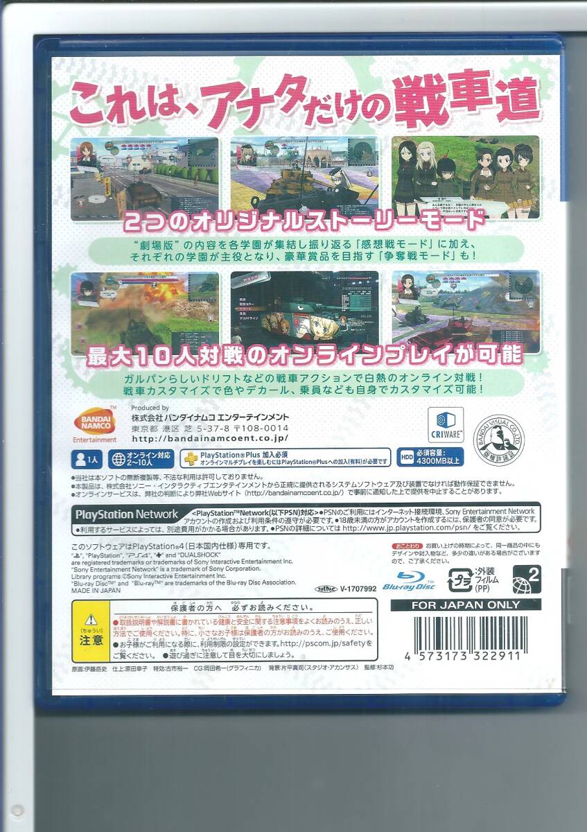 ●JANコード4573173322911 t2 ☆PS4 ガールズ&パンツァー ドリームタンクマッチ ●商品の状態 ソフトは使用感少なく状態良好ですが、書き込み(はじめからかもしれません)・シワなど説明シートに使用感、ケースにスレ・イタミがあります。 |