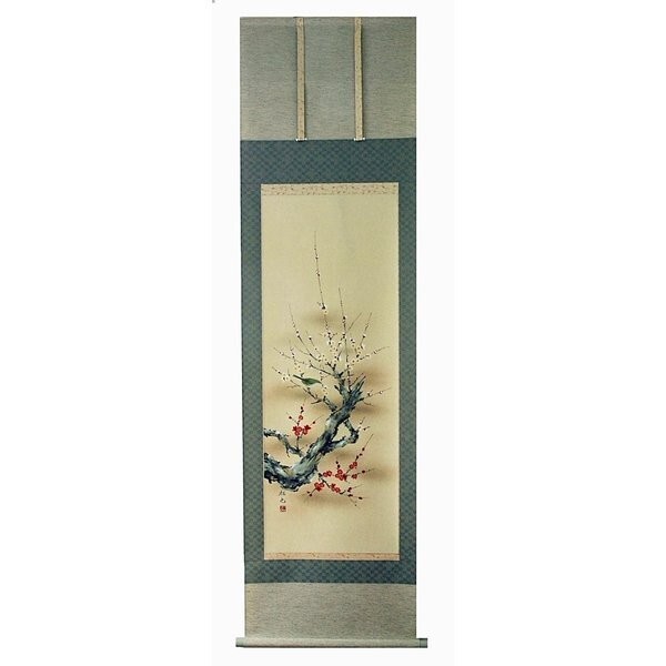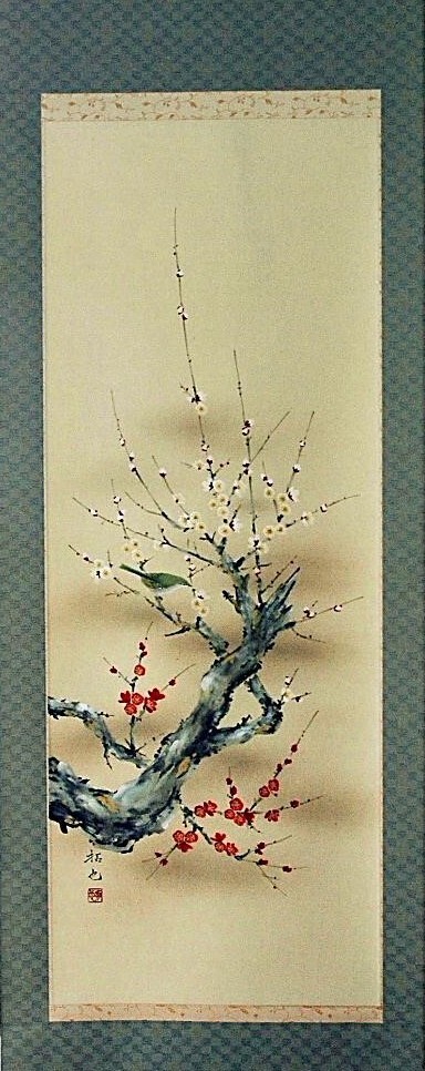 掛け軸 掛軸 純国産掛け軸 床の間 慶祝画 年中掛け 「紅白梅に鶯」 奥田拓也作 尺五 桐箱付