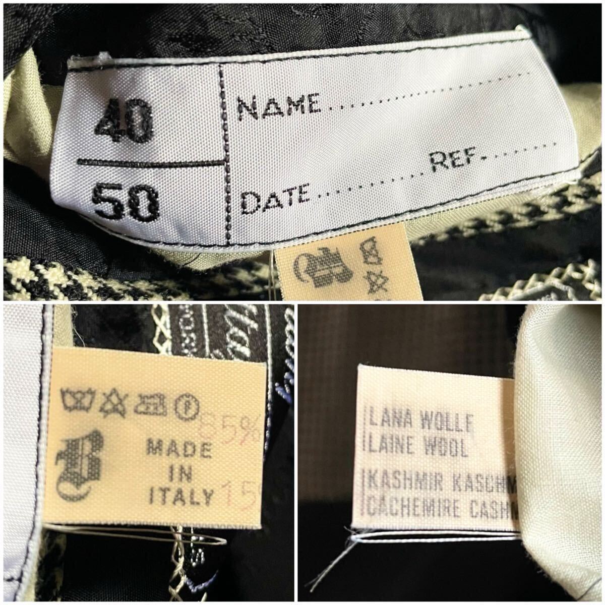 特徴的なくるみボタンが細部にアクセントを加え、高級感と特別感を兼ね備えたデザインに仕上がっています。裏地にはロゴ総柄を採用し、見えない部分にもこだわりを感じさせるディテール。サイズは50で、イタリア製の卓越した仕立てが快適な着心地と美しいシルエットを保証します。フォーマルシーンからラグジュアリーな場面まで幅広く活躍する一着です。