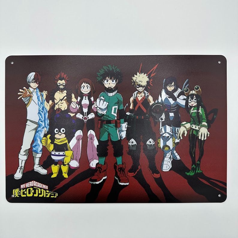 人気アニメ『僕のヒーローアカデミア』の主要キャラクターが勢揃いした、迫力あるブリキ看板です。