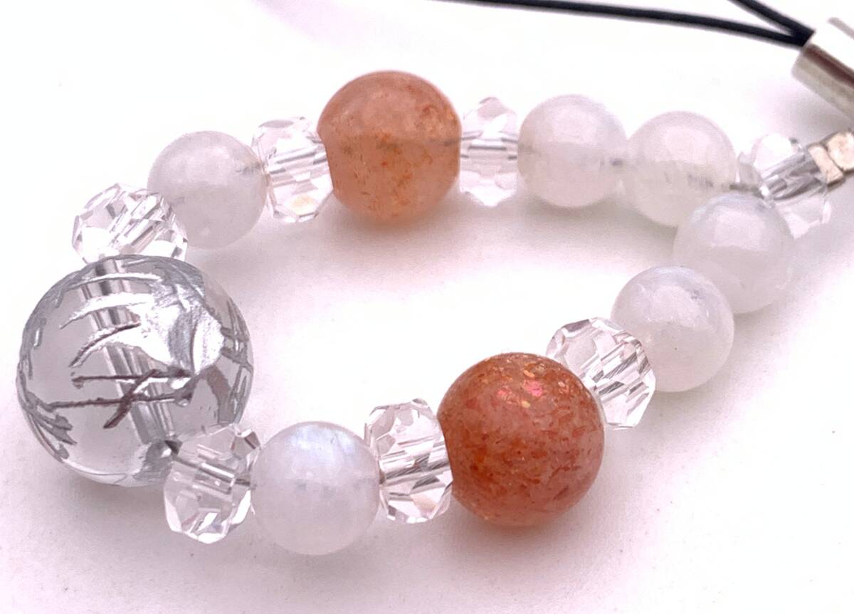 天然石水晶銀彫り青龍&サンストーン&ムーンストーンのストラップ