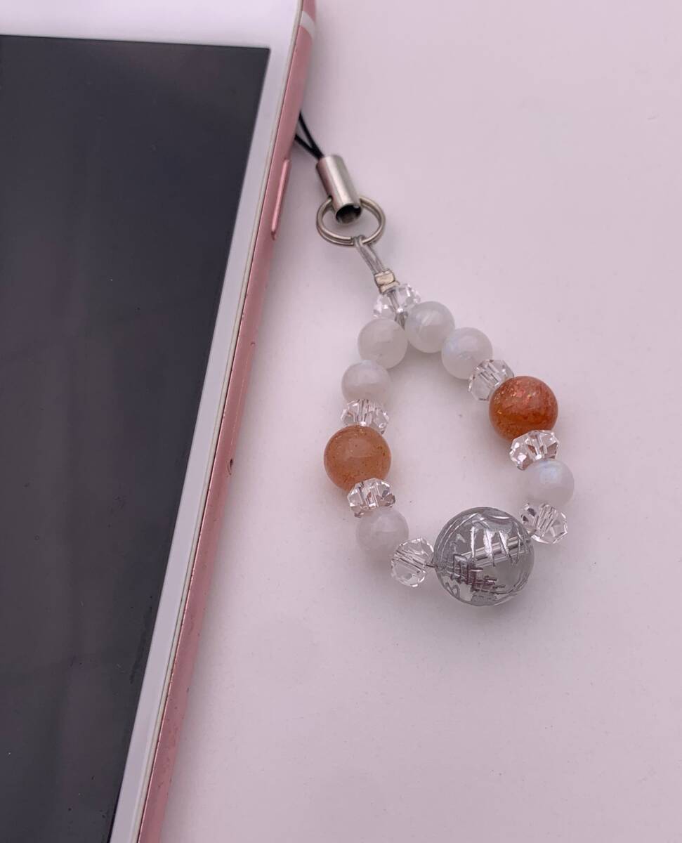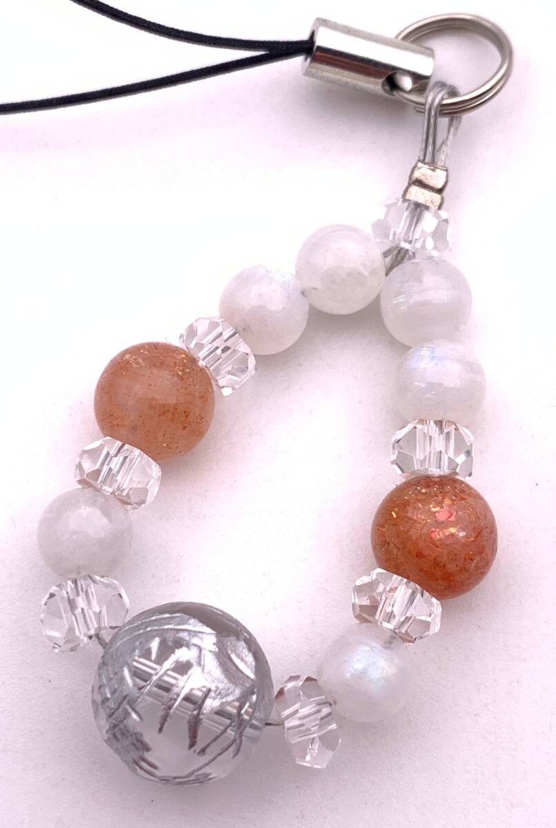 手作り!オリジナル!天然石水晶銀彫り青龍&サンストーン&ムーンストーンのストラップ