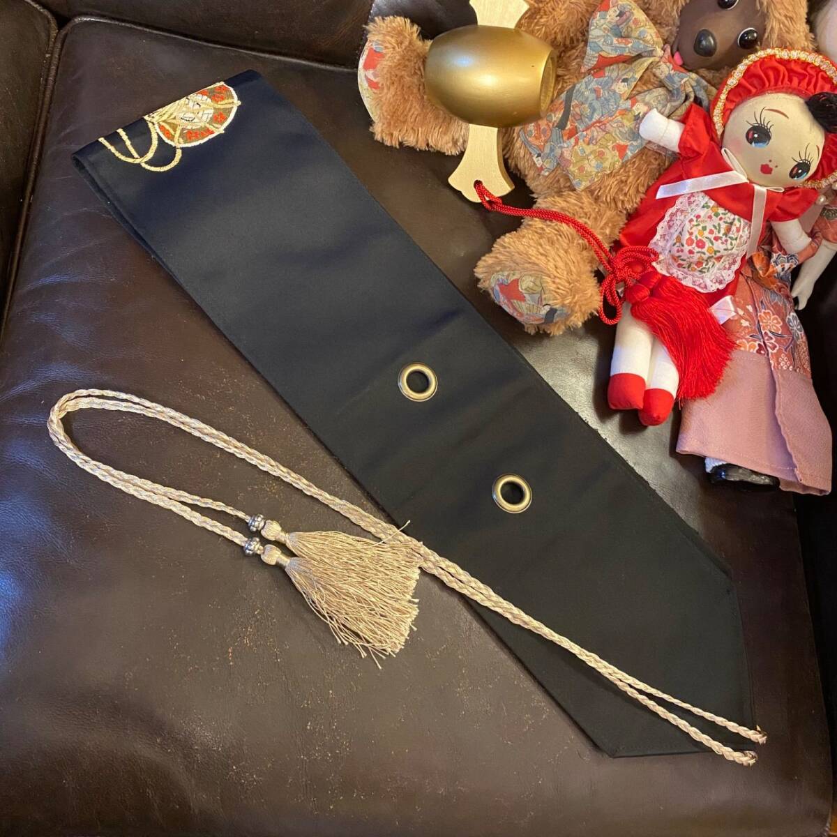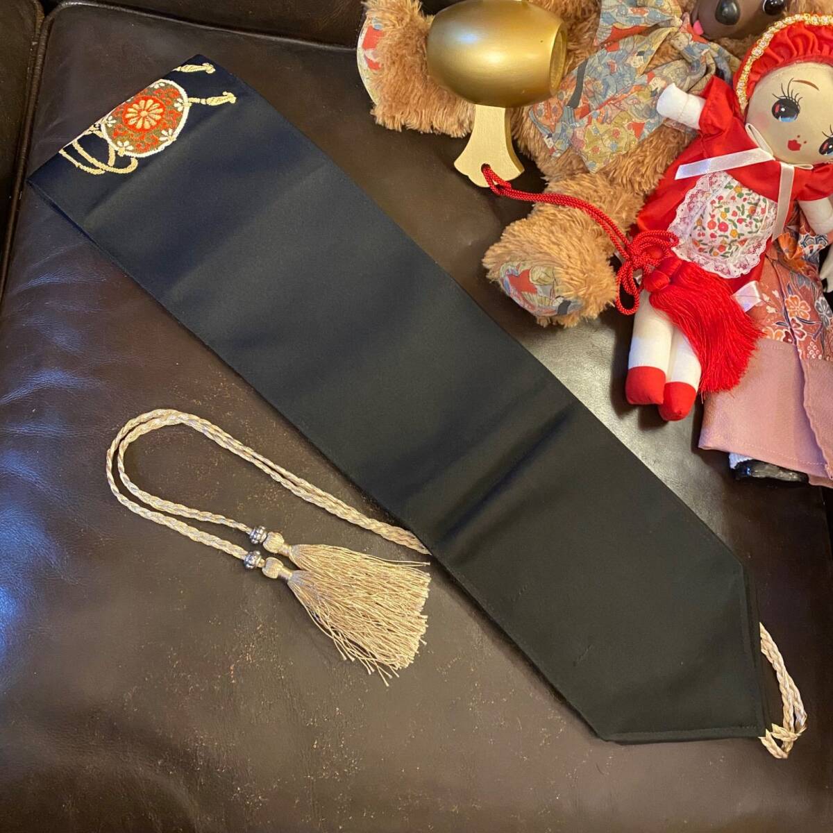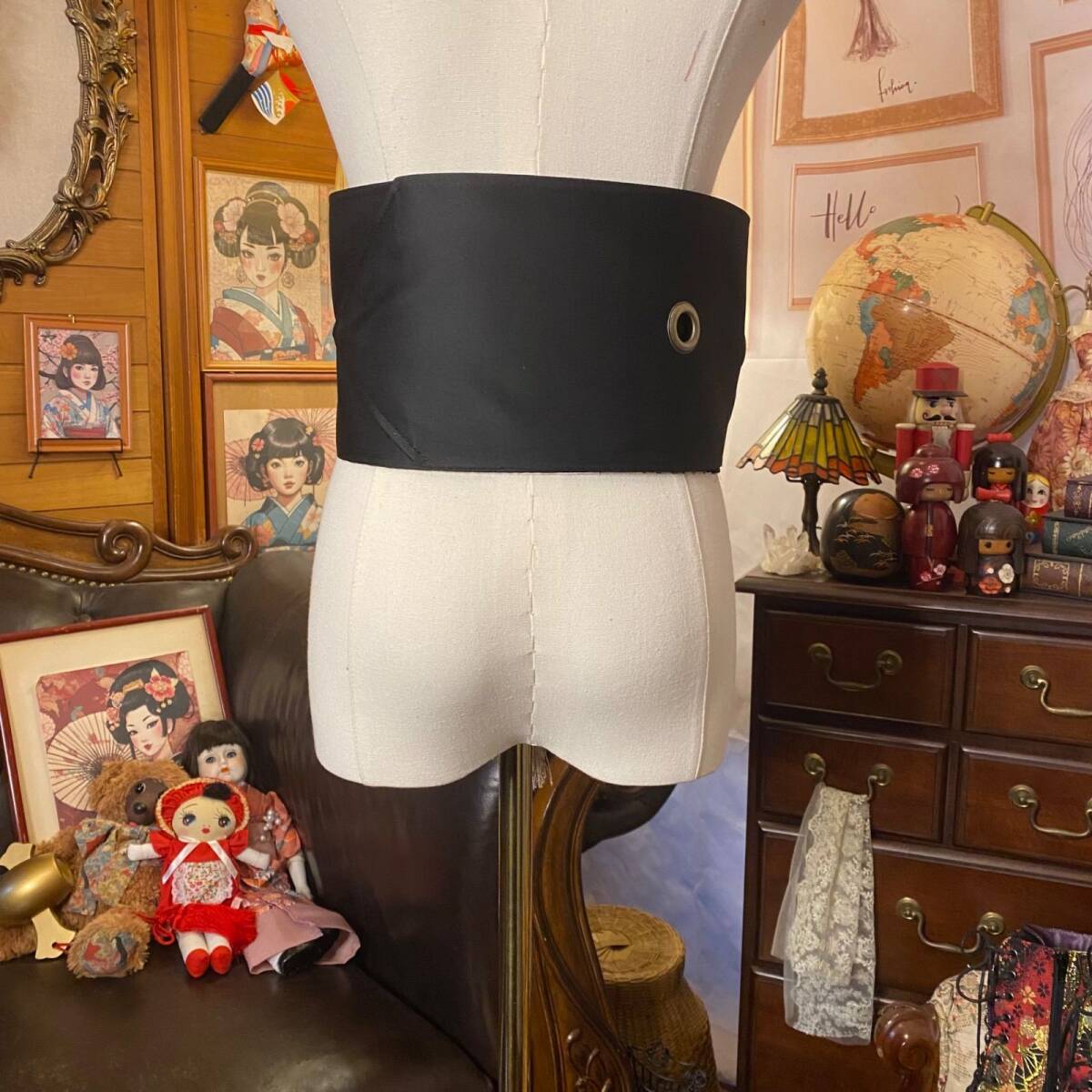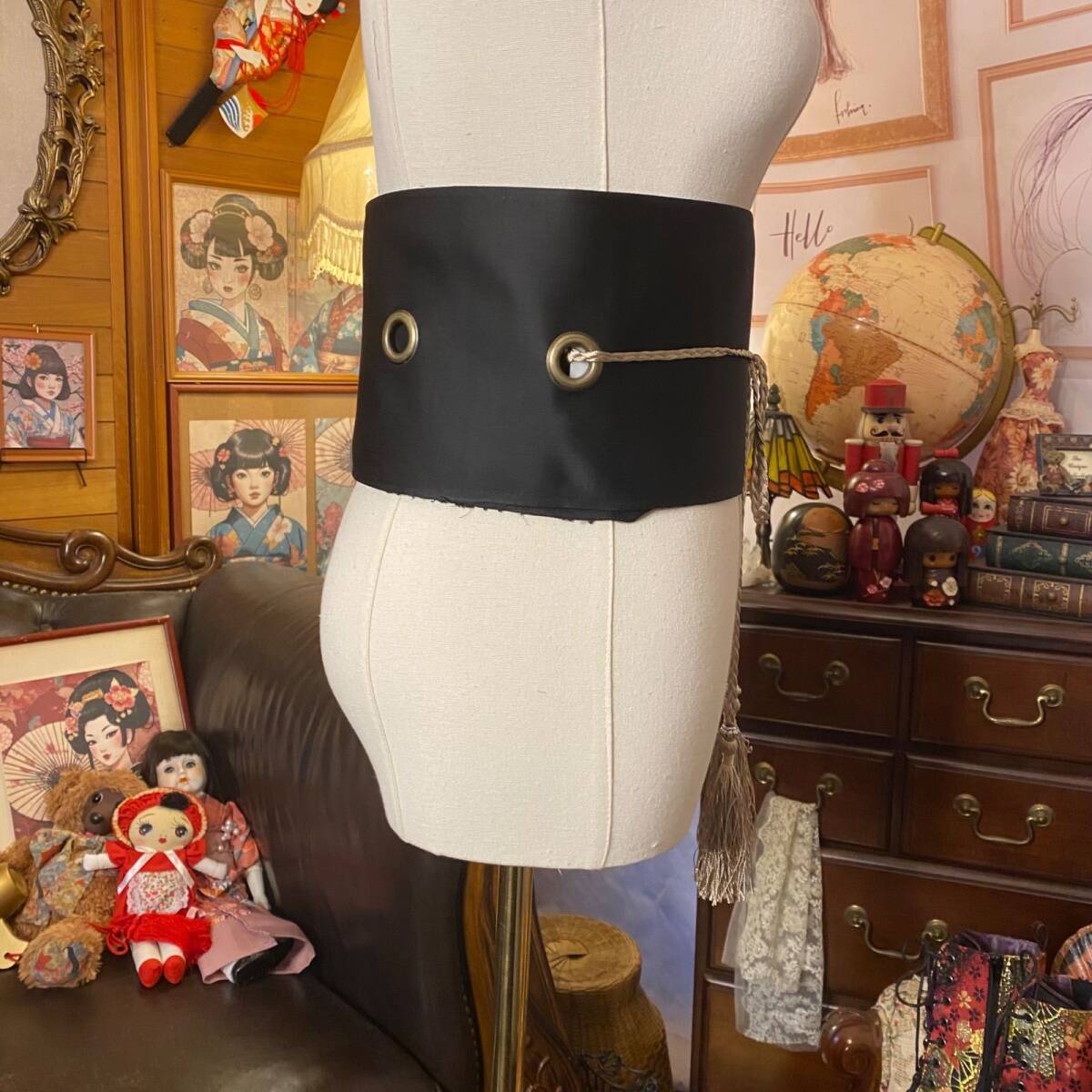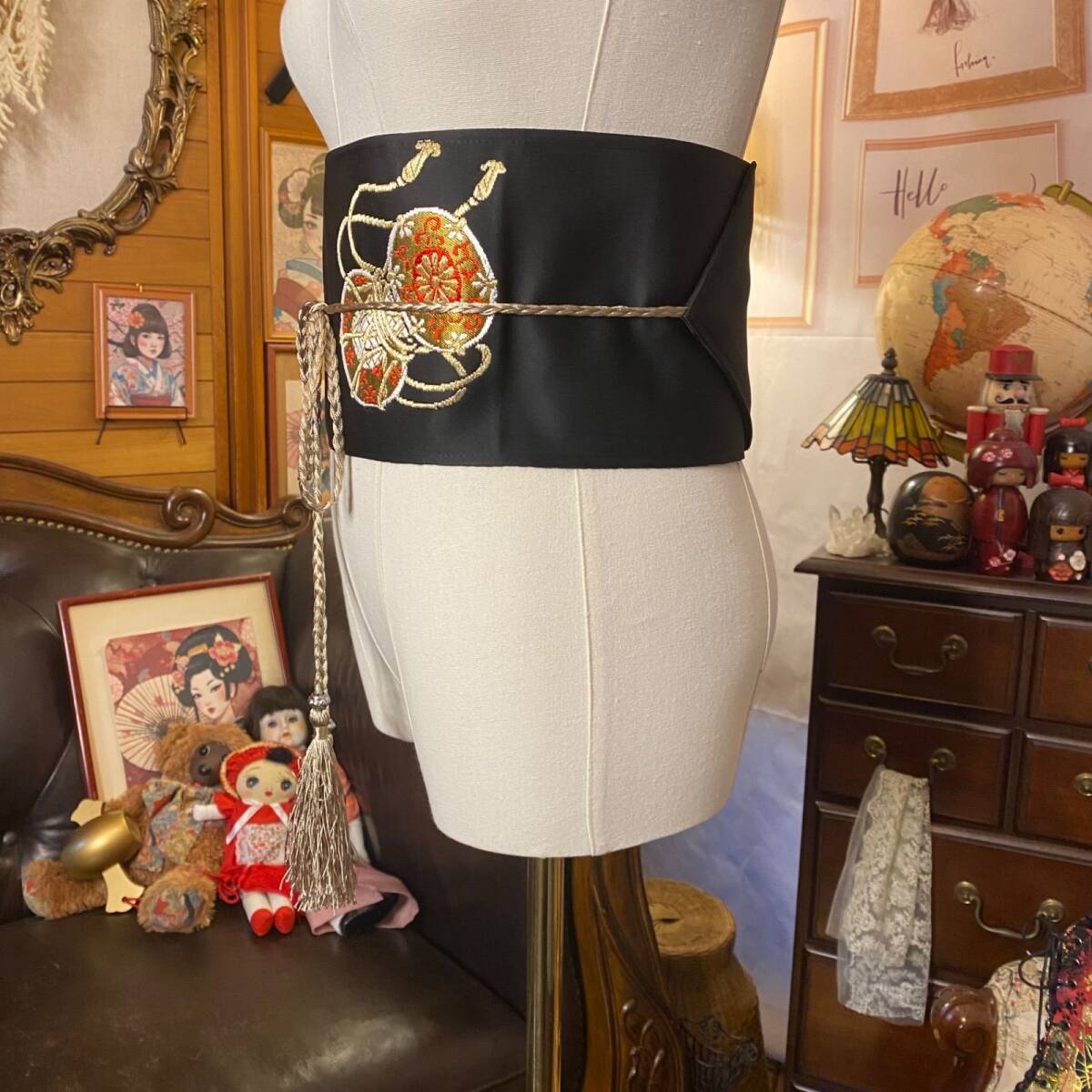 【名古屋帯 リメイク サッシュベルト 飾り帯 和洋折衷 ハンドメイド レトロ 古着 L〜LL対応 深く、静かな黒地のなかに、ひときわ映える金糸の文様。 ROB-98】
