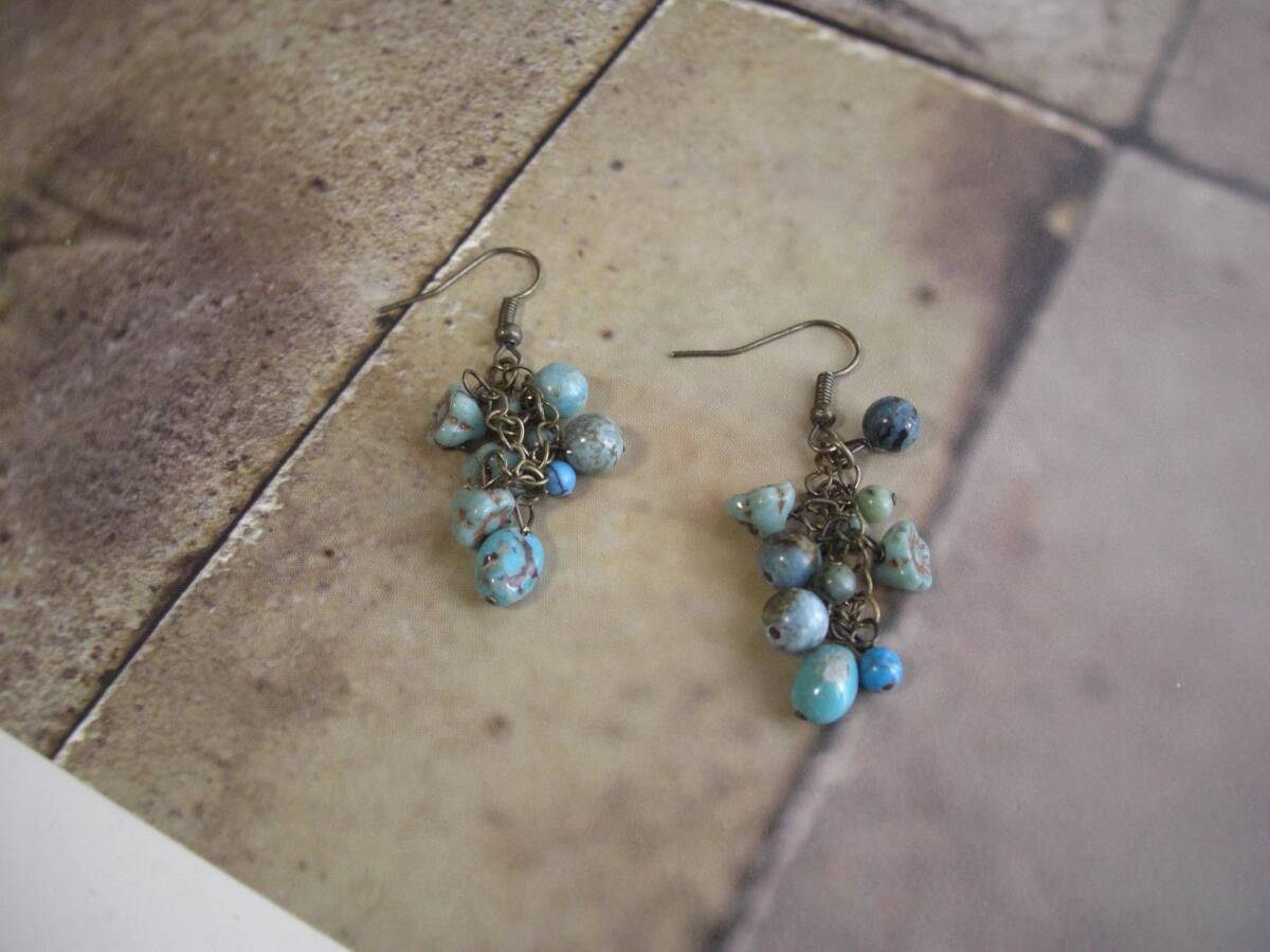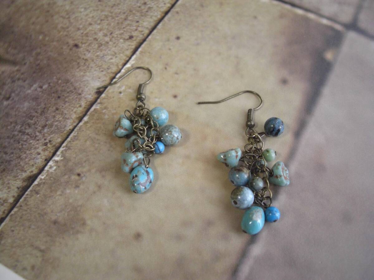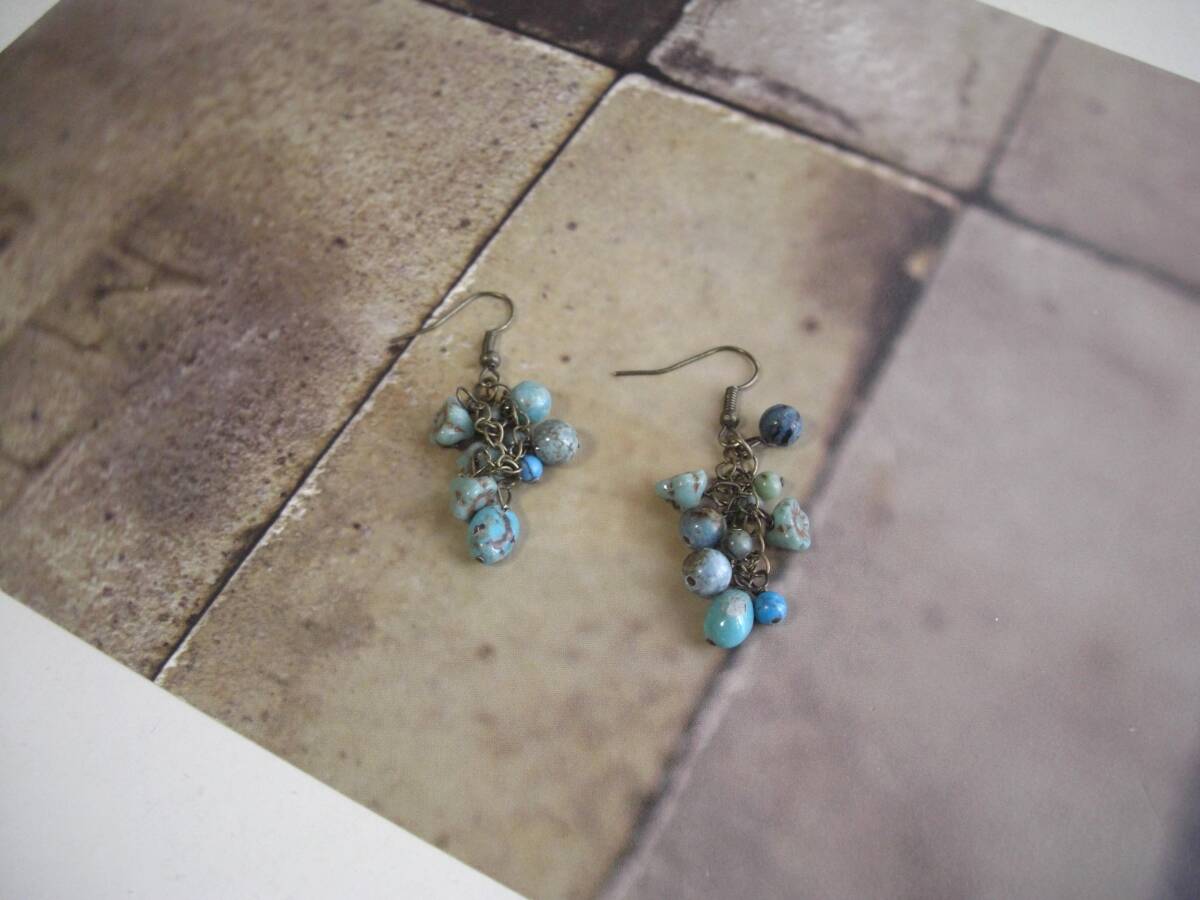 さりげなく着ける楽しみ‥シリーズです♪可憐な青色を集めて・・ターコイズやブルーオパール、デニムラピスなど色合いの違うブルーを集めてブーケのようにまとめました♪4ミリから7ミリ位までの丸玉やミニタンブルなどデザイン違い、大きさ違いです♪チェコビーズのお花を添えて可憐な表情です♪長さは全長5・5センチ位です♪イヤリングに変更も可能です♪お揃いのネックレスやブレスレットも出品しています♪シンプルで飽きのこないいつまでも着けられるデザインを考えて作りました!ハンドメイドをご理解頂いてノークレーム、ノーリターンでお願いします