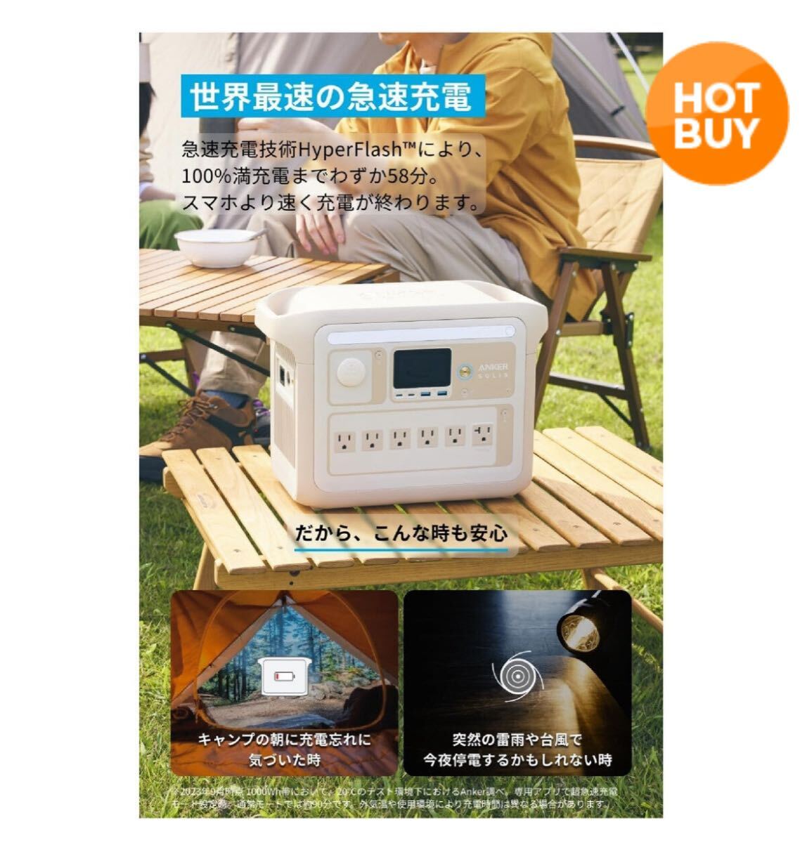 ※2023年9月時点 1000Wh帯において、20°Cのテスト環境下におけるAnker調べ。専用アプリで超急速充電モード設定時。通常モードでは約90分です。外気温や使用環境により充電時間は異なる場合があります。