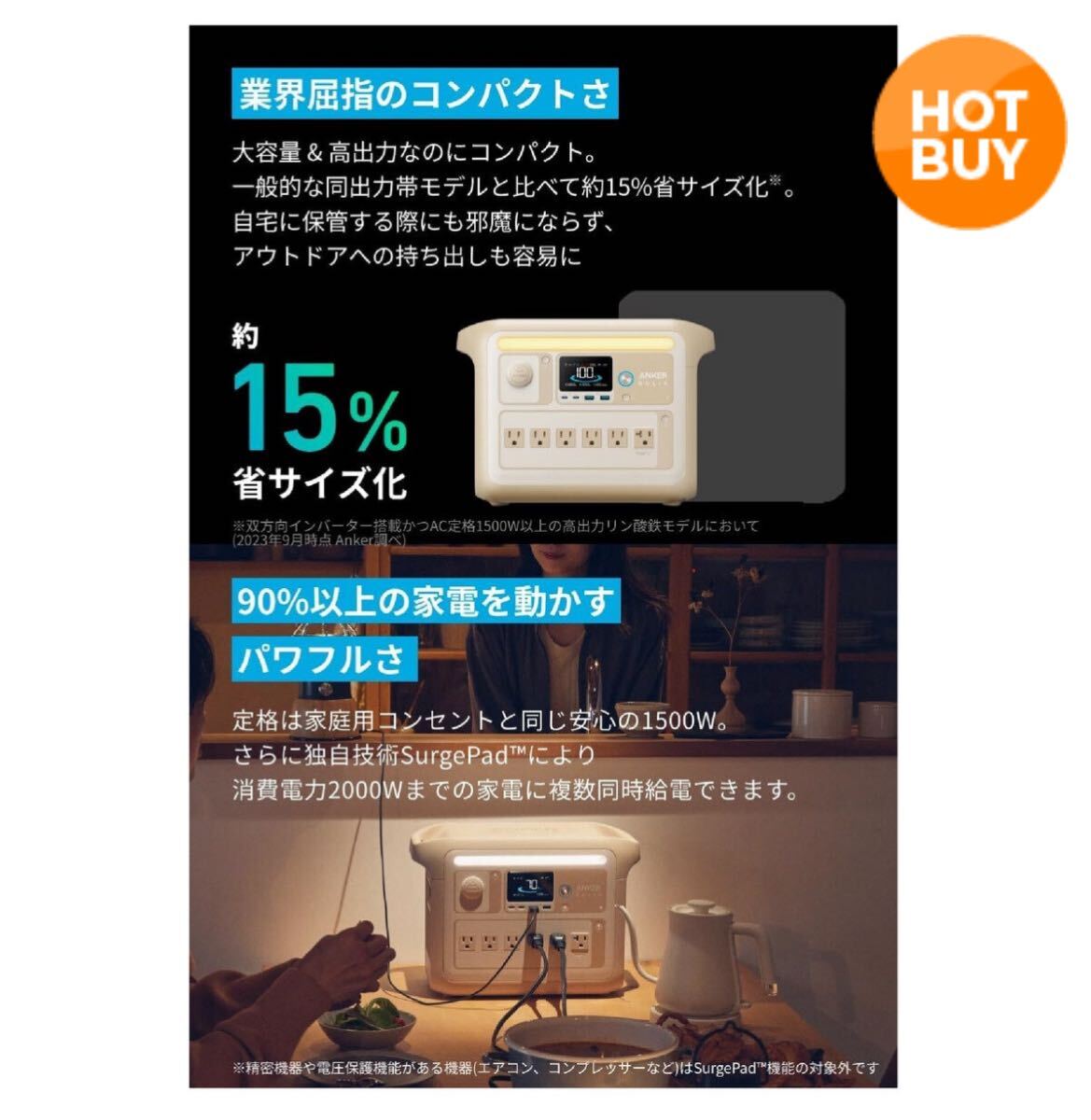 ※双方向インバーター搭載かつAC定格1500W以上の高出力リン酸鉄モデルにおいて (2023年9月時点 Anker調べ)。