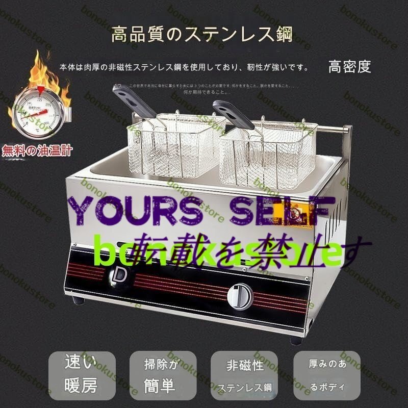 商品の説明 商品の説明商品の説明商品情報: 名前:商用ディープフライヤー ガスタイプ:プロパン 建材:ステンレス鋼 フライバスケット:コーティングされたハンドル付きの丈夫なメッシュスタイル バスケットの数:2;サイズ:18x21cm オイル容量:10リットル(10L * 2)サイ