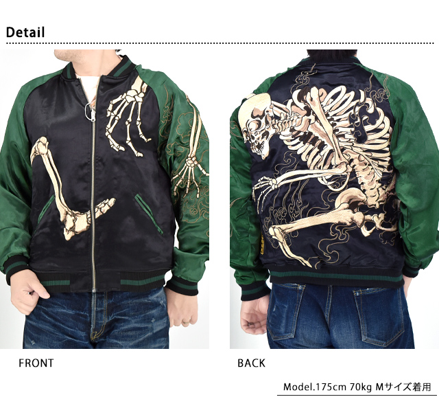 絡繰魂さんから「粋 がしゃどくろ支配リバーシブルスカジャン(252025)」のご紹介です。 重みを感じる程の刺繍量が魅力的な絡繰魂から、最新作のスカジャンが登場しました。 今回モチーフの主役に採用されたのは、おどろおどろしいがしゃどくろ柄。 柄は身頃から袖へと続いており、実際に着用した際には身体のラインに沿って柄がより立体的に浮かび上がります。 また、今回のスカジャンはリバーシブル仕様になっています。 ボディーにはレーヨンサテンを使用し、ドレープや陰影がくっきりと現れています。 | ||||||||||||||||||||