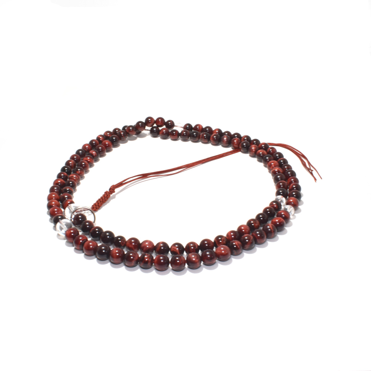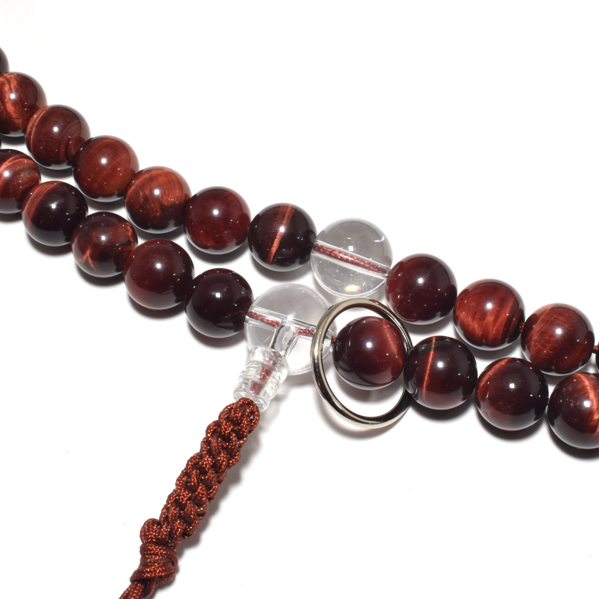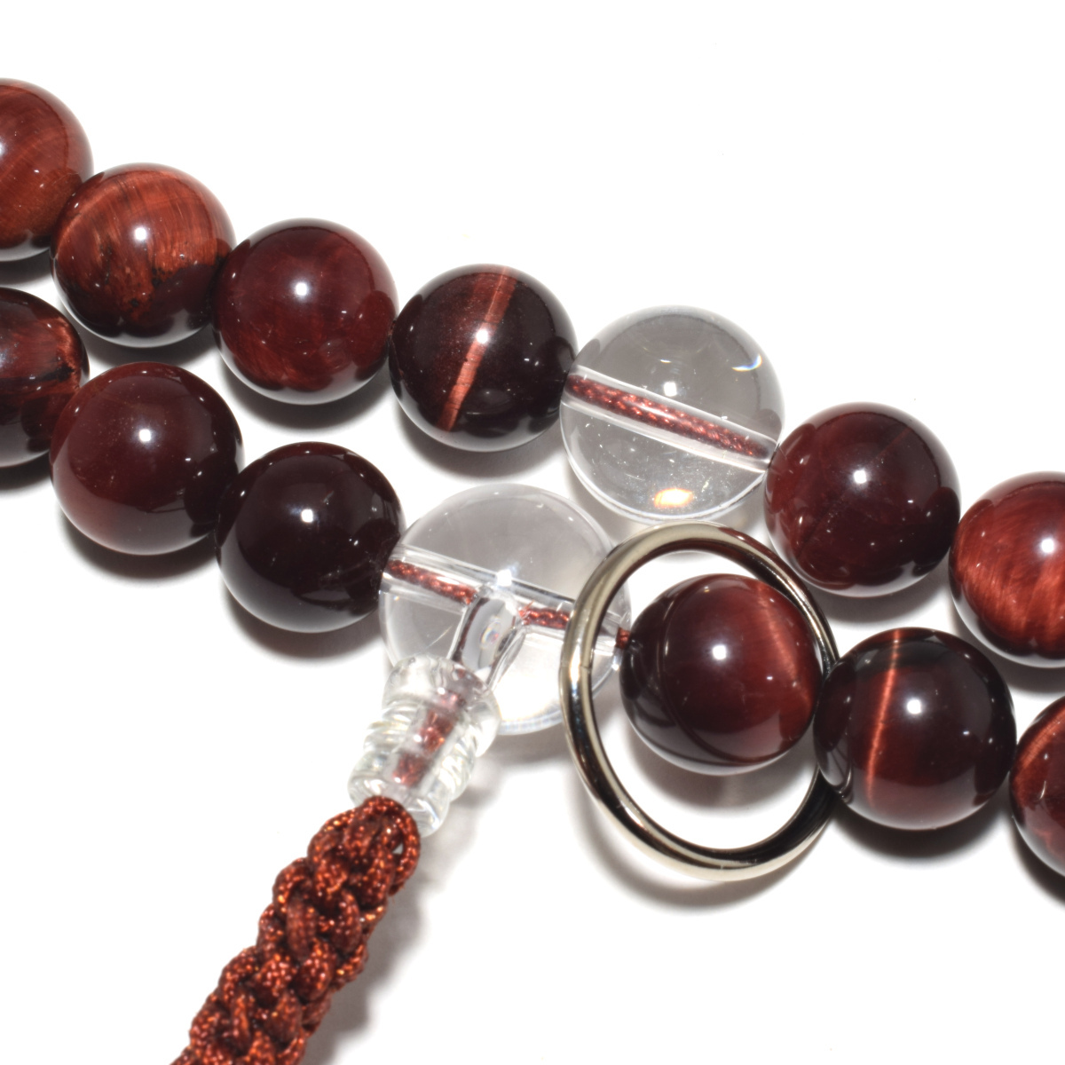 商品説明 | 主玉(赤虎目石) 約 12mm 天玉(水晶) 約 10mm 向玉(水晶) 約 14mm 親玉(水晶) 約 16mm 輪の引き伸ばしサイズ 約 66cm |
