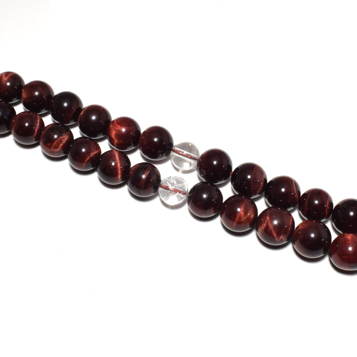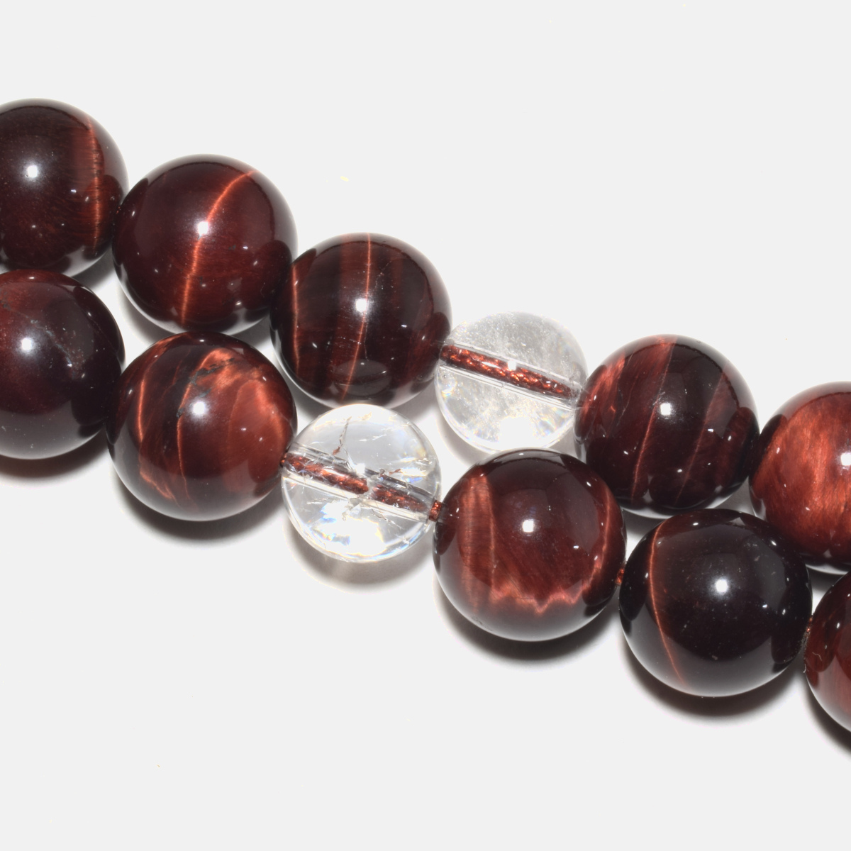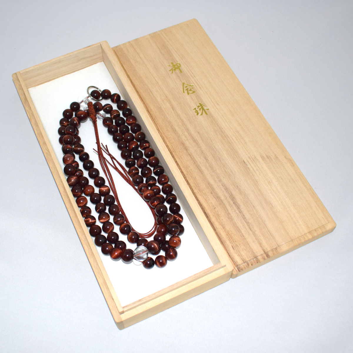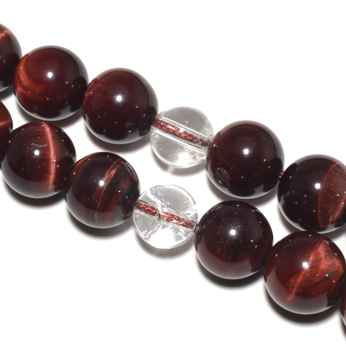 商品説明 | 主玉(赤虎目石) 約 12mm 天玉(水晶) 約 10mm 向玉(水晶) 約 14mm 親玉(水晶) 約 16mm 輪の引き伸ばしサイズ 約 66cm |